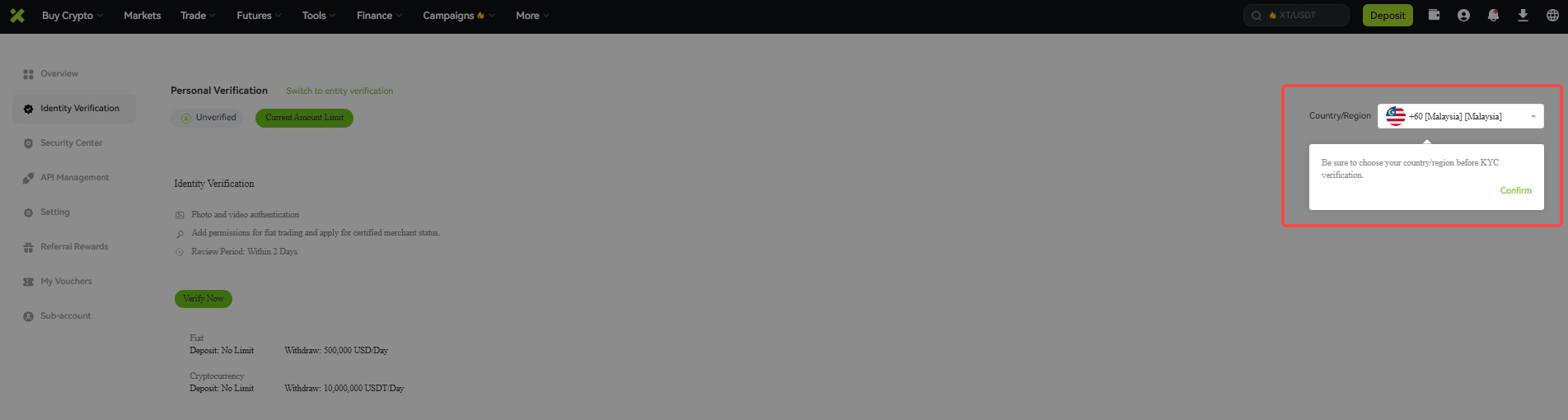 Choose your country/region from the options on your screen. Different countries/regions have different limits and authentication channels. XT.COM supports the Sumsub or manual channels. Refer to the prompts to determine which verification method to use. Make sure the information you enter matches the information on your ID documents.