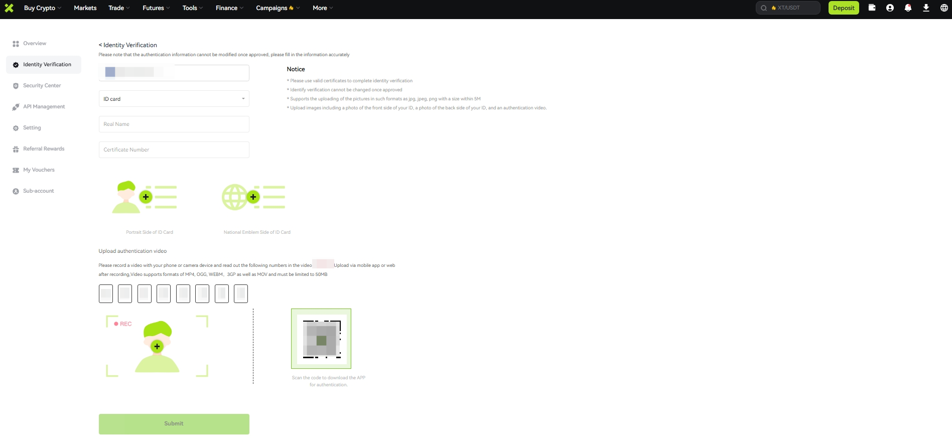 After clicking 'To Verify' in the previous step, choose your document type, real name, and document number. Follow the on-screen instructions to upload photos of your document and a verification video.