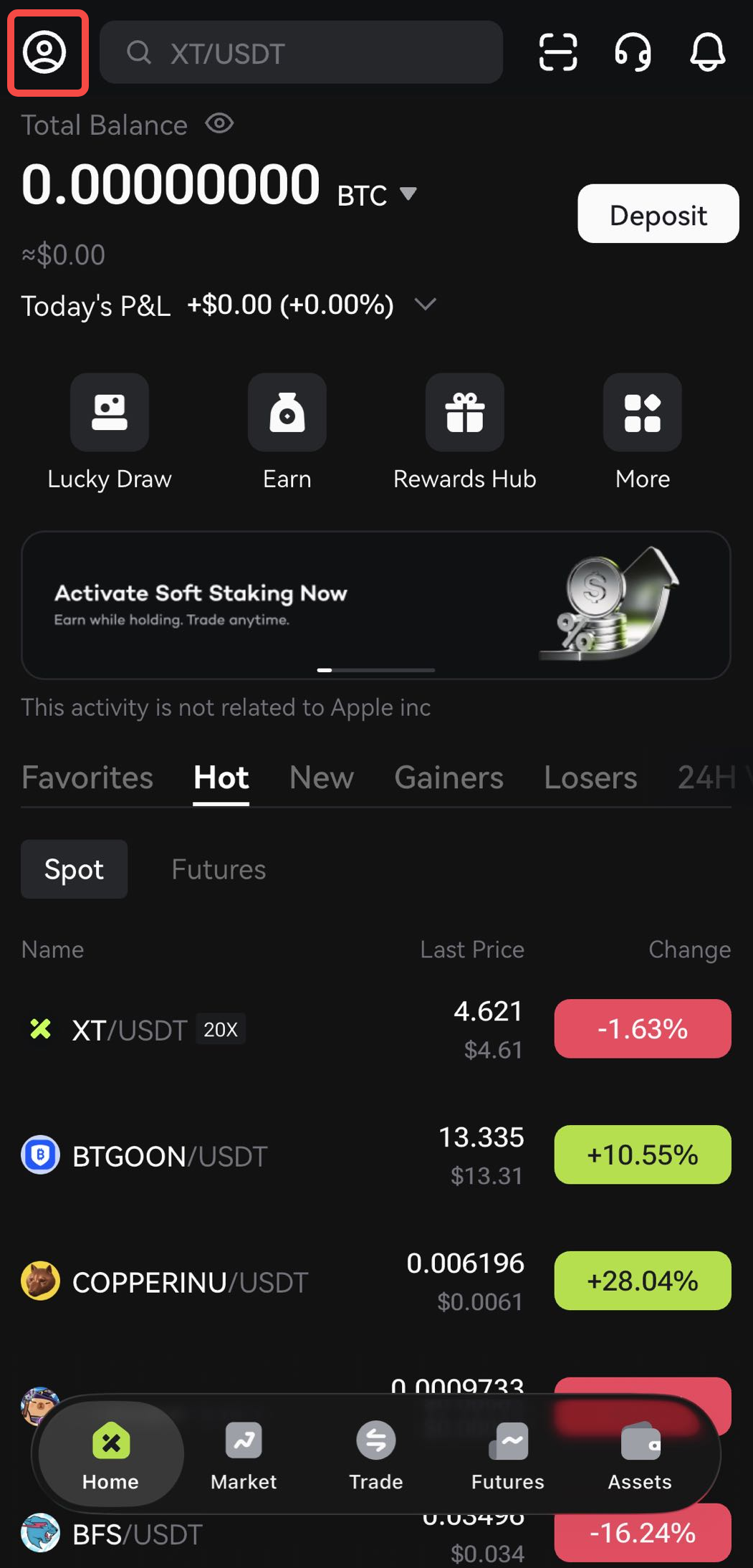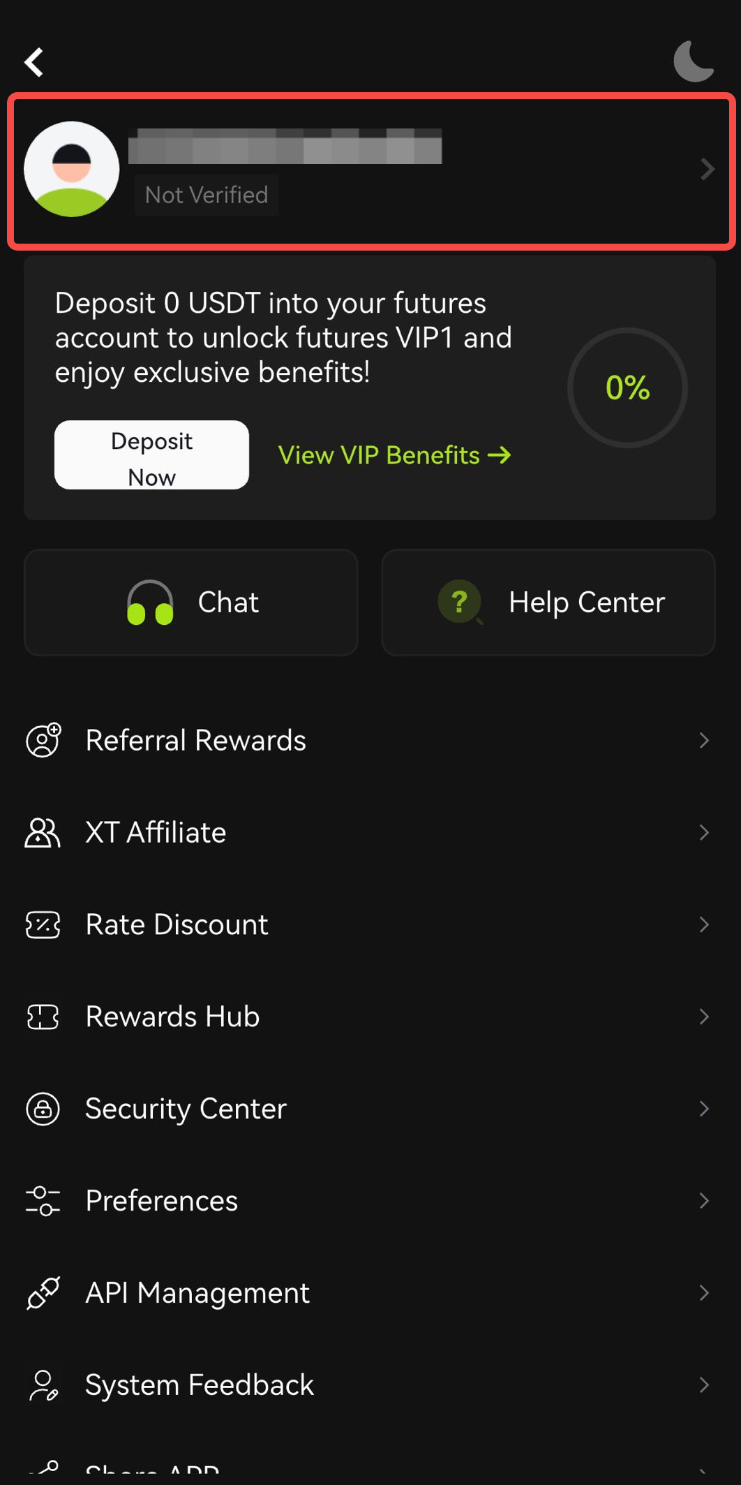 Log in to the XT.COM mobile app and click on the top left corner to access the personal center.