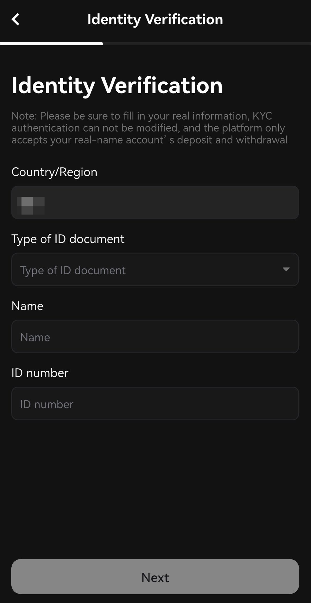 After selecting your country/region, proceed to the KYC verification page. Provide your details in order and click 'Next'.