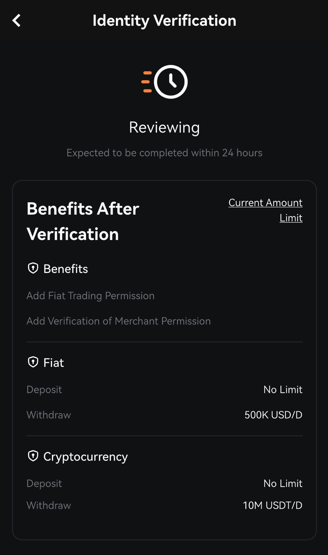 A: Completing KYC verification improves account security. Users who complete KYC have access to higher daily withdrawal limits, legal transactions, and P2P merchant features. Additional identity verification may be required depending on your location or chosen payment channels in order to provide enhanced security.