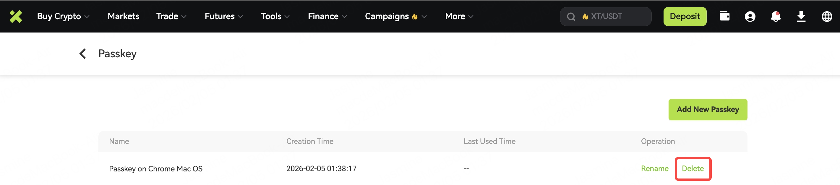 4. You have successfully added the passkey to your XT account. The created key is saved only on this device.