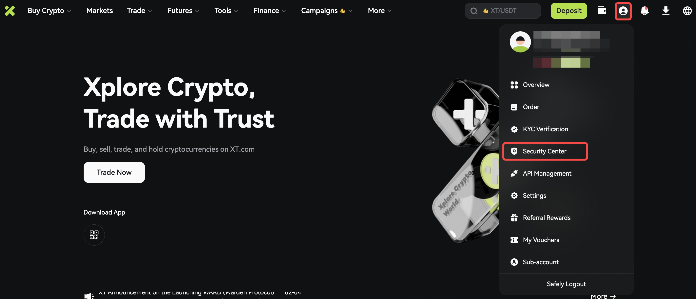 1. Log into your XT account, click on the "Personal Center" icon at the top of the page, and select "Security Center".
