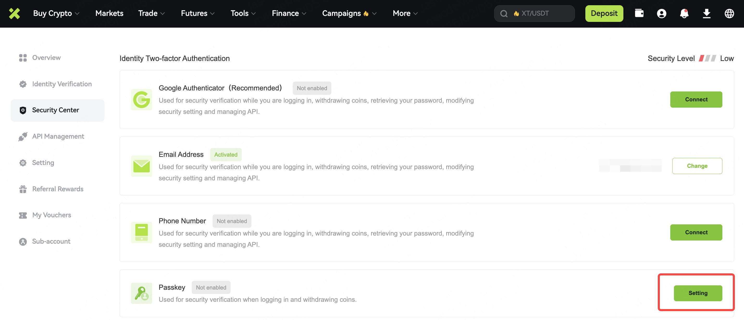 4. A popup box will appear. Confirm your XT account email address and select the verification method you wish to use for the new passkey.