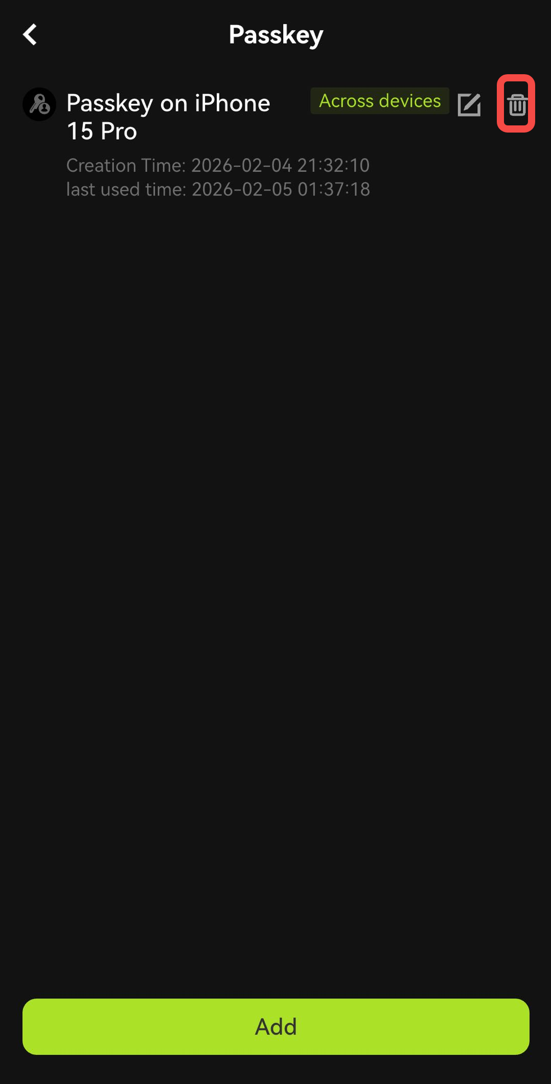 • To delete a passkey, click on the "Delete" icon and complete the verification using the passkey or two-factor authentication.