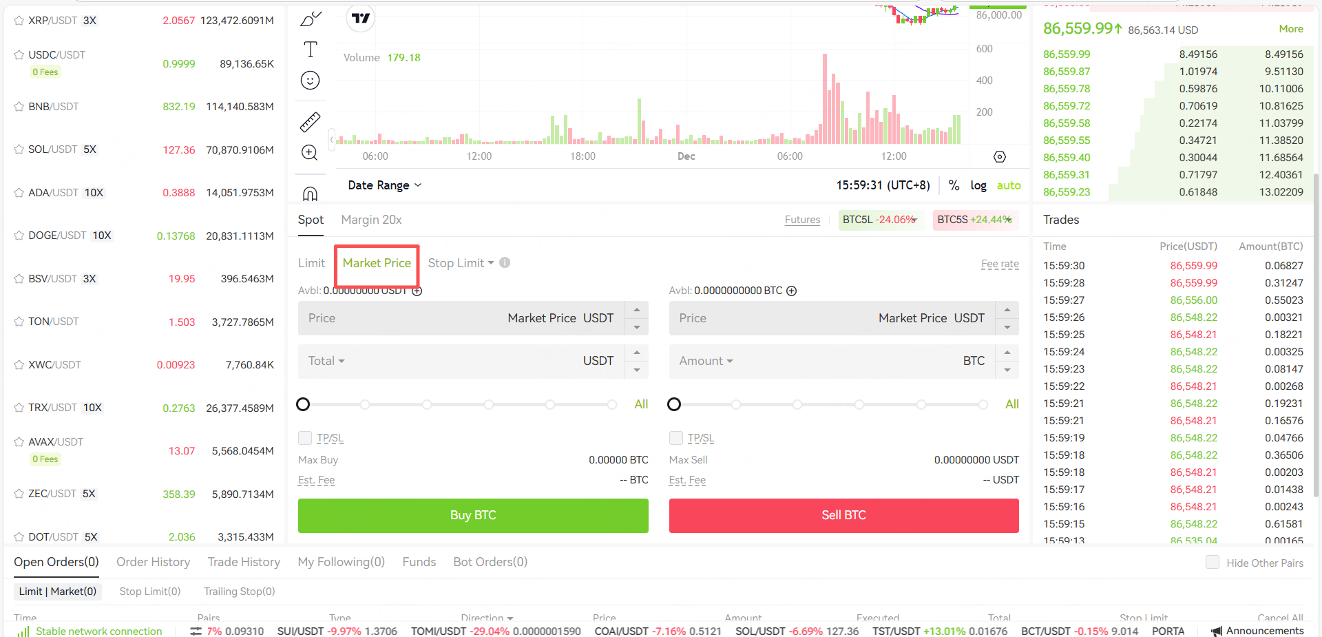 (Market Order means that the user immediately executes the buy or sell at the best price in the current market to achieve quick trading. Please note: if the total market price of a single transaction is too large, there will be cases where the unfinished part will be cancelled. Meanwhile, market orders will settle orders on the market regardless of cost, so you need to bear some risks. Please place orders carefully and be aware of risks.)