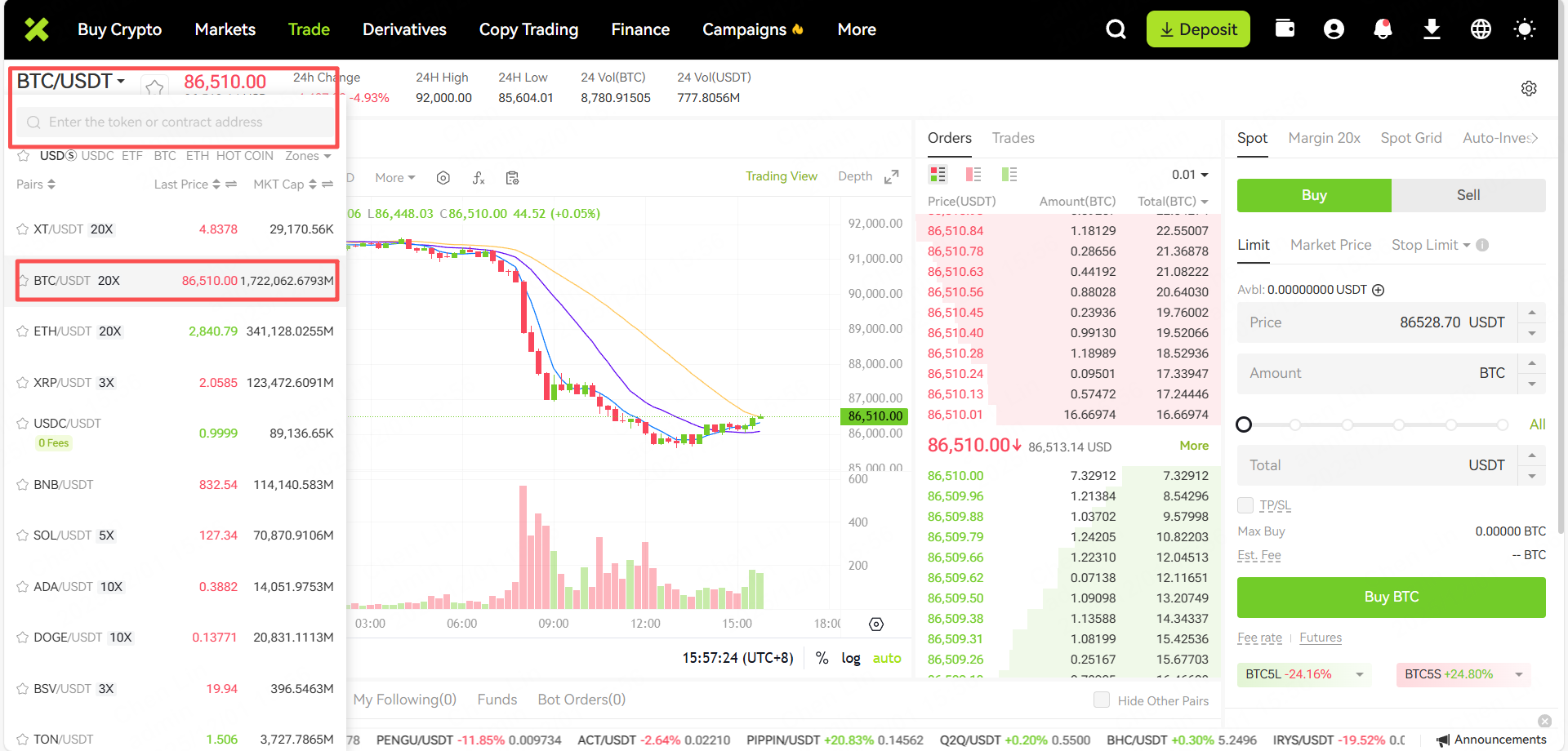 Step 2: Take [Standard Spot] as an example. Please select the currency you want to trade in the trading area. We will use "BTC/USDT" as an example. You may also select other currencies through "Search".