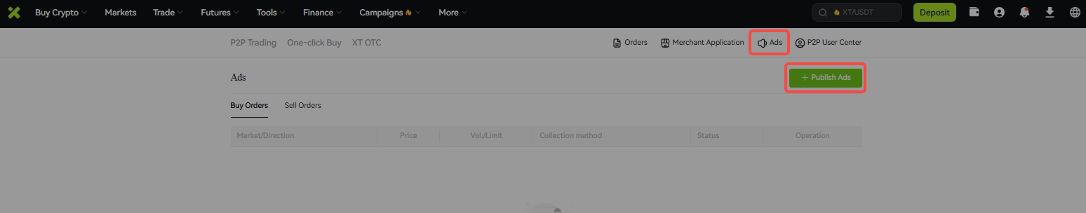 Enter [P2P Trading], click [Ads Management], and then click [Publish Ads]. Before publishing an advertisement, you need to add and activate the payment method and bind the mobile phone number.