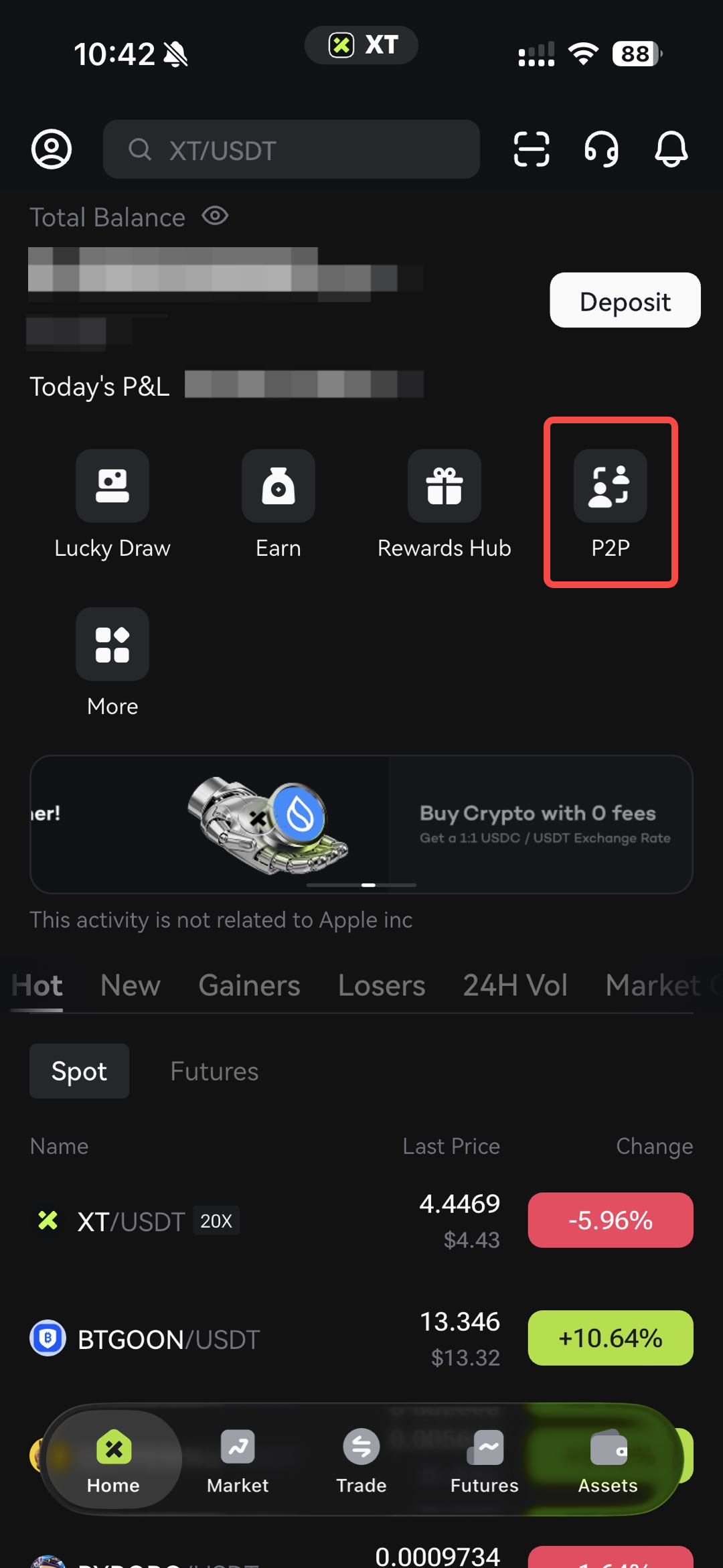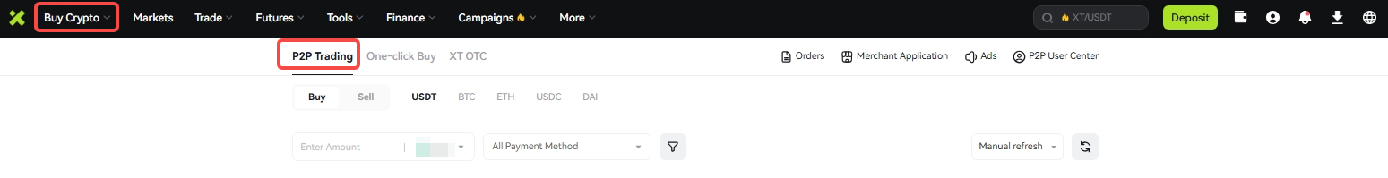 Enter the official website https://www.xt.com/, log in to your account, click [Buy Crypto] on the top of the page and then click [P2P Trading].