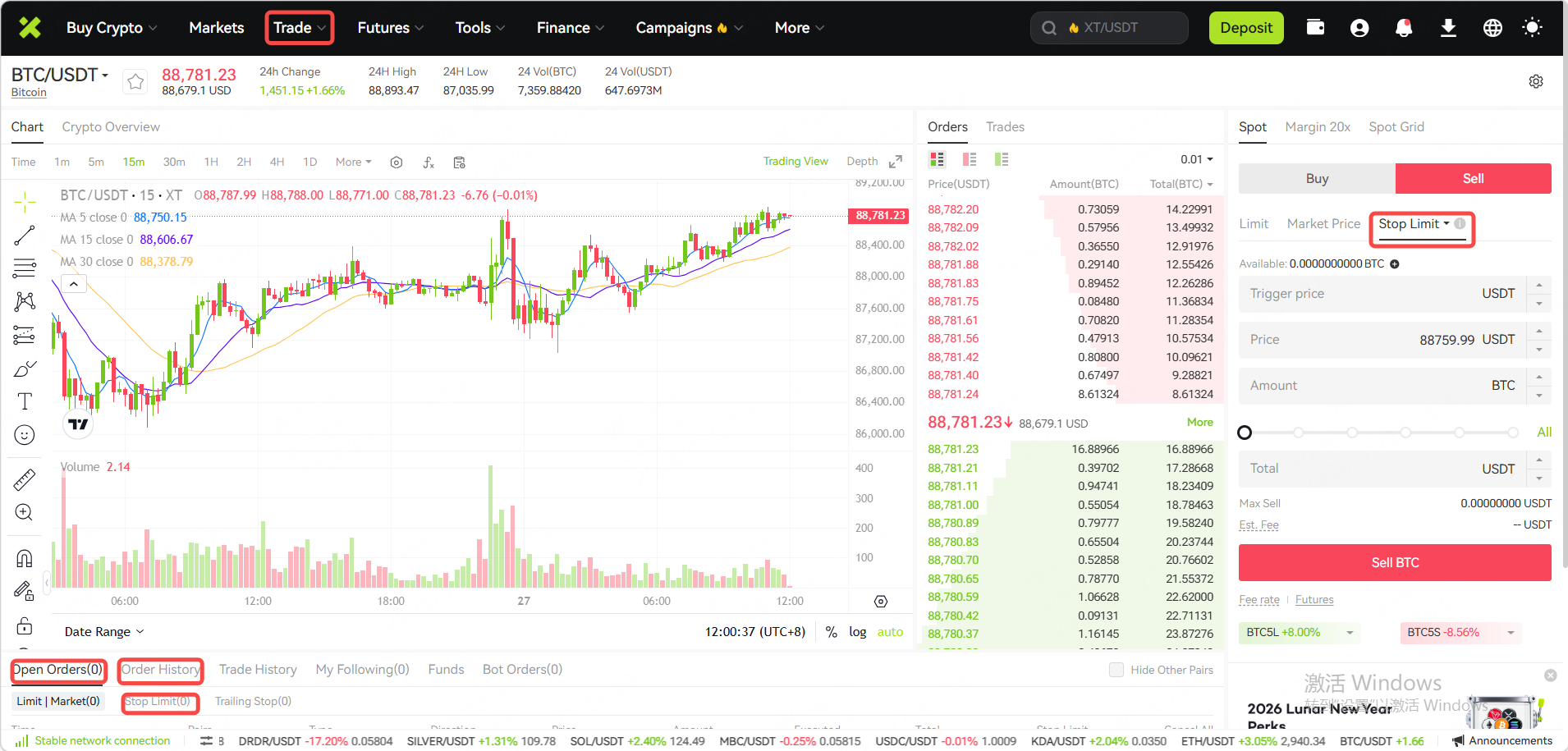 Log in to your XT account, click “Trade” at the top and select “Spot”, and choose the “TP/SL” (Take-Profit/Stop-Loss) order type. Set the order direction (buy/sell), trigger price, price and amount, then confirm your settings to place the TP/SL limit order.