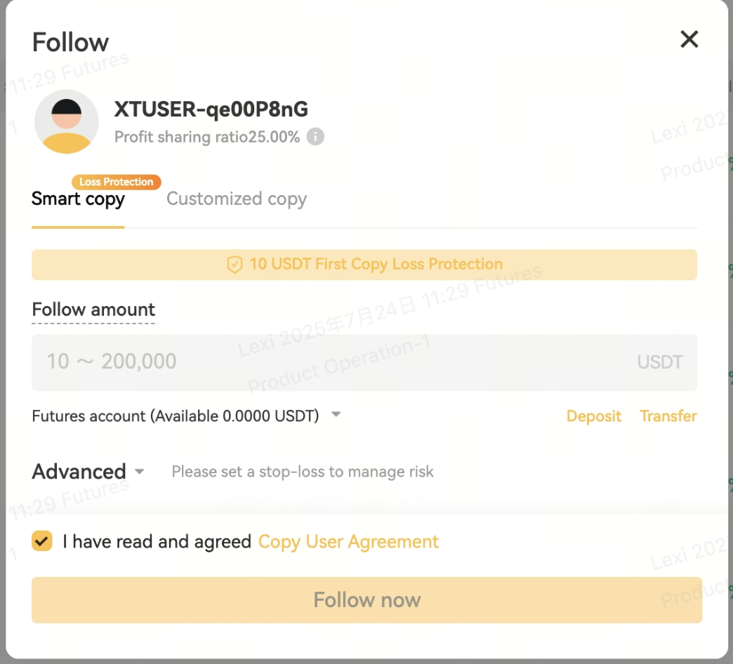 ووچر پوشش ضرر در کپیتریدینگ، نوعی ووچر محافظت از ریسک است که بهطور خاص برای کاربران کپیتریدینگ هوشمند طراحی شده است. پس از دریافت این ووچر، اگر اولین سفارش کپیتریدینگ کاربر (در پیروی از یک تریدر) با ضرر بسته شود، پلتفرم طبق قوانین (تا سقف ارزش اسمی ووچر، به USDT) غرامت پرداخت میکند.