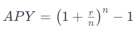 فرمول محاسبه APY مشابه فرمول APR است، با این تفاوت که اثر ترکیب سود را نیز لحاظ می کند: