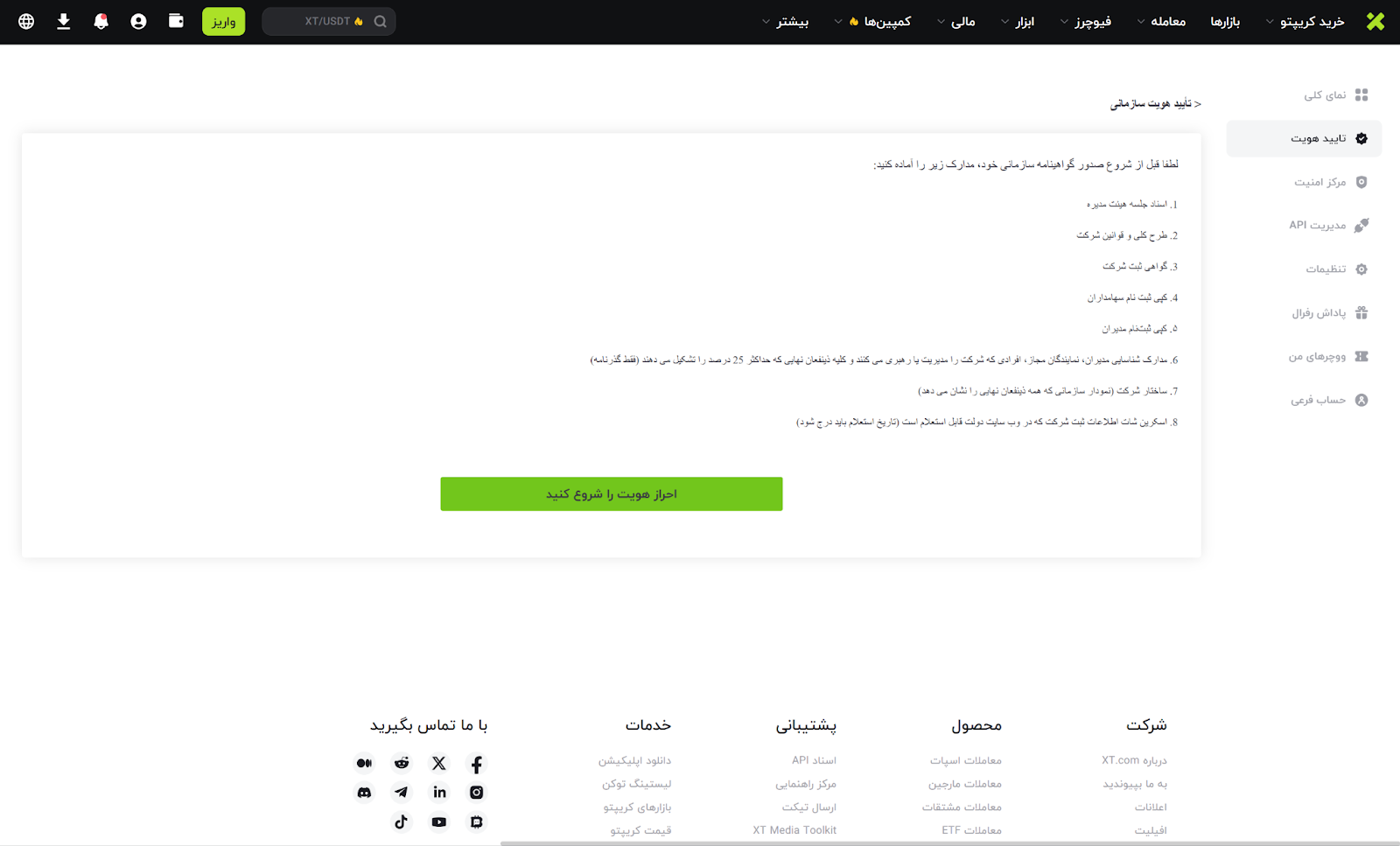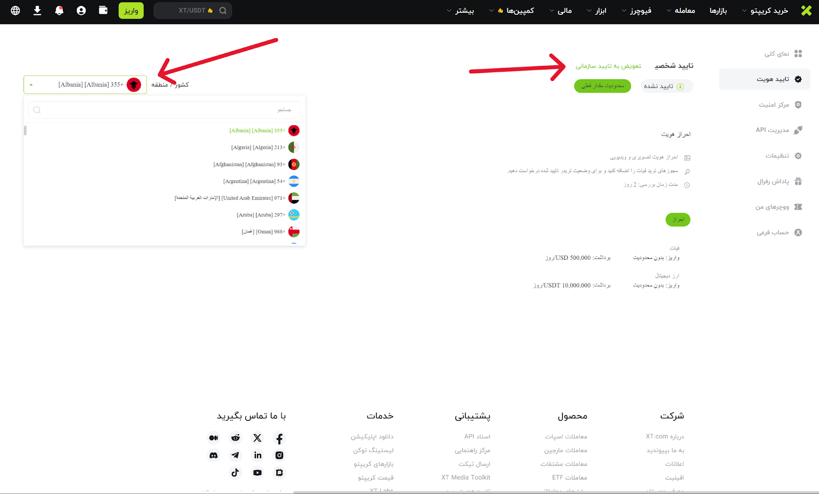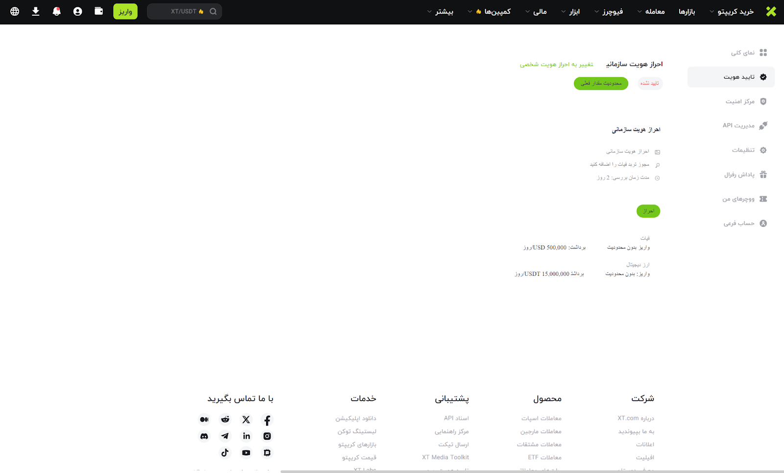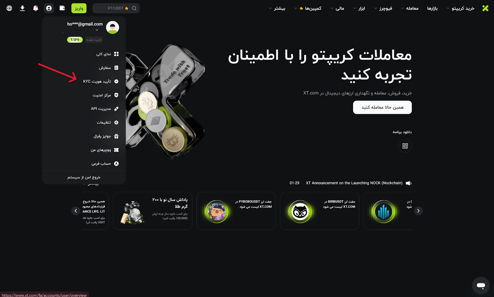 به آدرس https://www.xt.com مراجعه کرده و وارد حساب کاربری خود شوید. سپس روی آیکون پروفایل کلیک کرده و گزینه تایید هویت KYC را انتخاب نمایید.