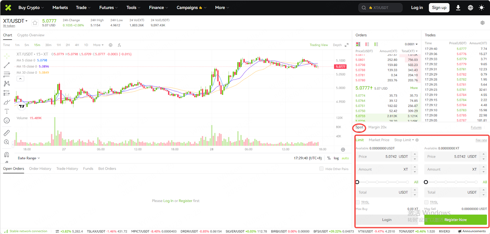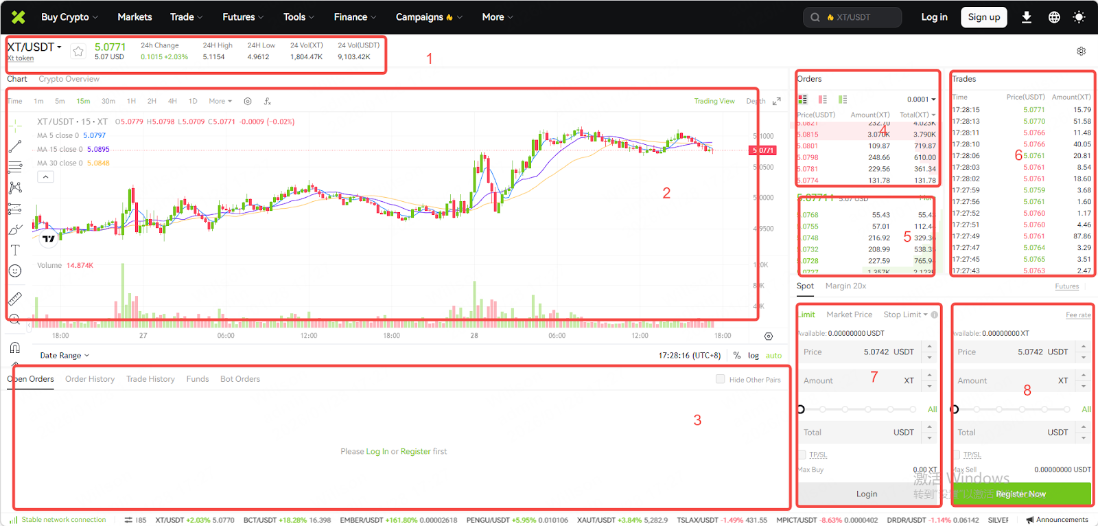 رابط معاملات اسپات (با استفاده از نسخه تمام صفحه XT/USDT به عنوان مثال):
