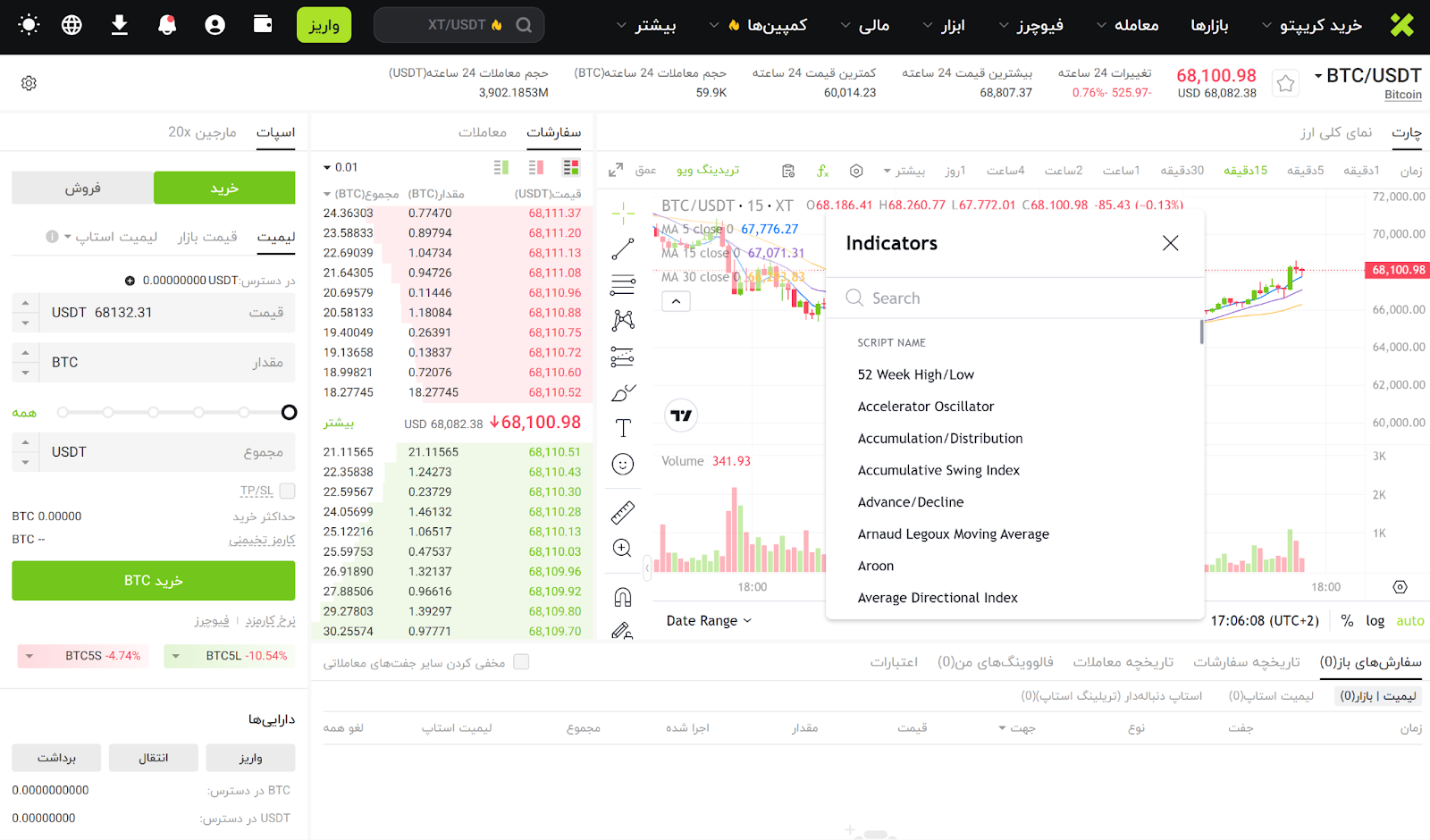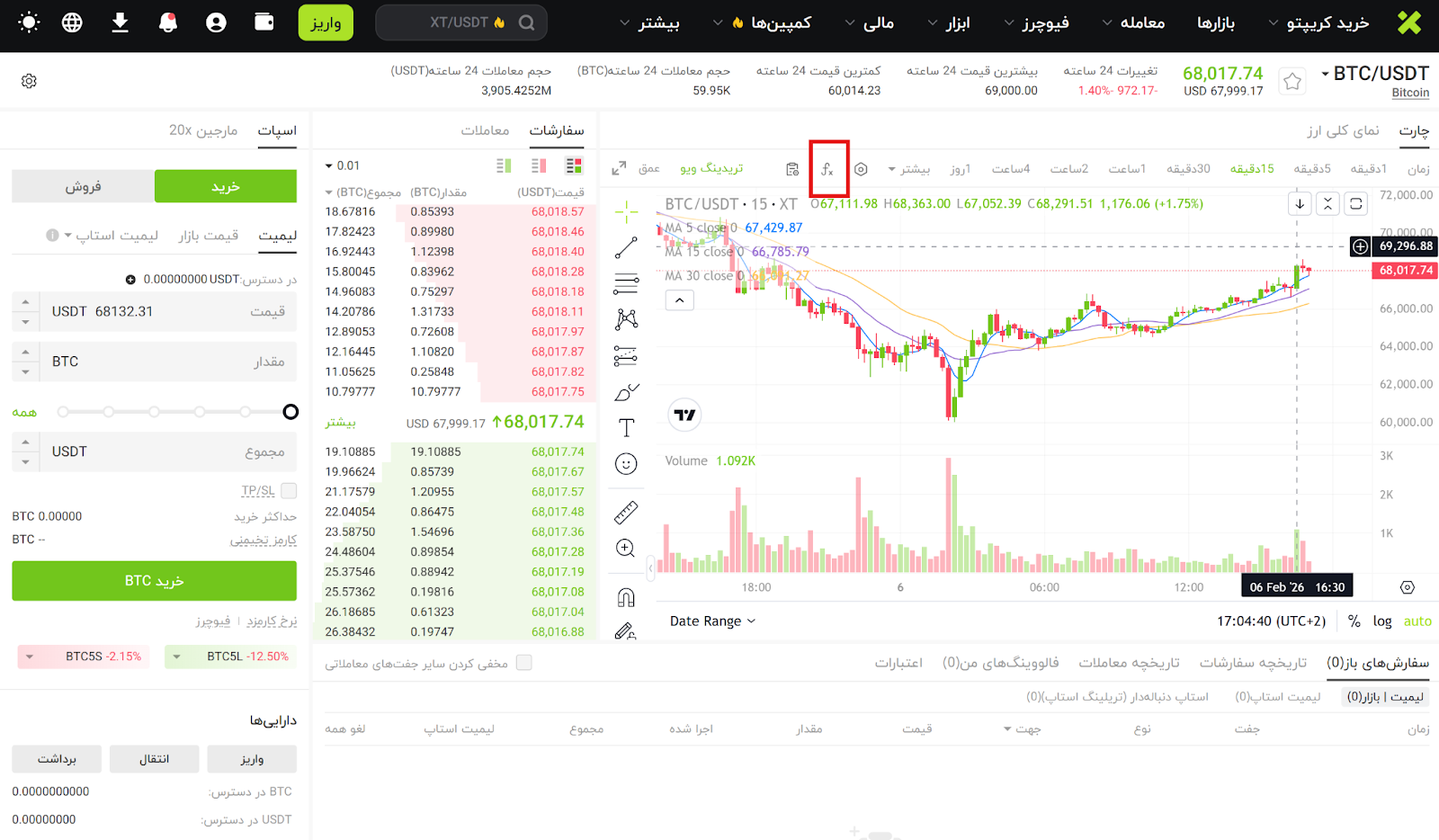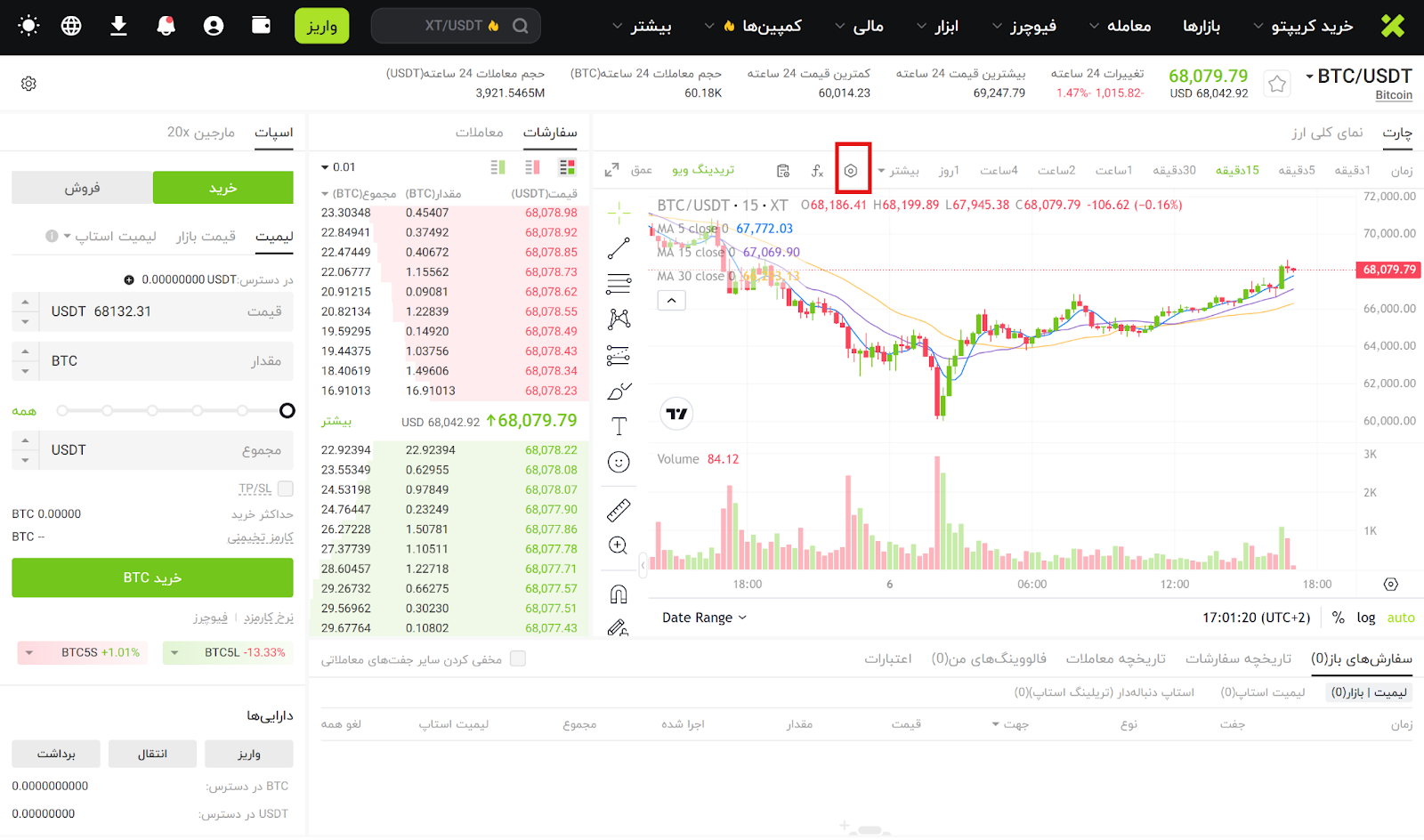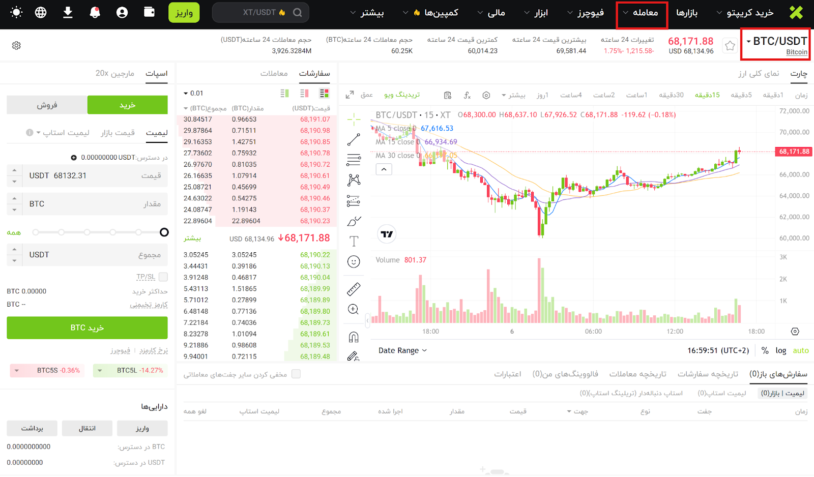 پس از ورود به حساب کاربری، روی گزینه معامله کلیک کنید تا وارد رابط معاملاتی لحظه ای شوید و سپس بازاری که قصد معامله در آن را دارید انتخاب کنید (برای مثال BTC/USDT).