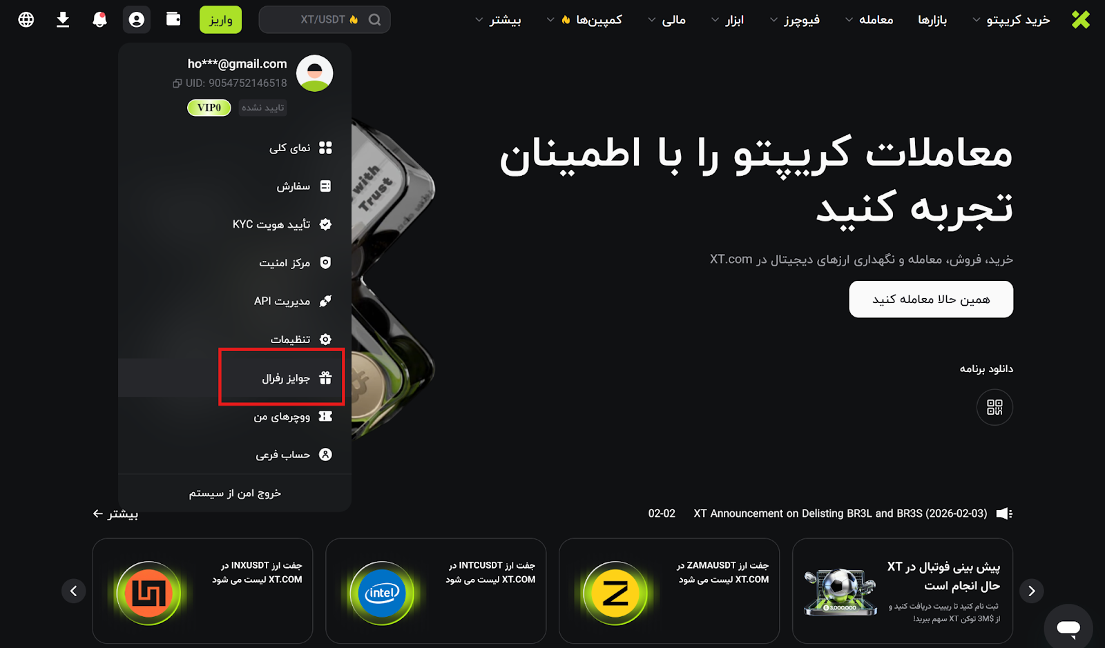 وارد حساب XT خود شوید و از زیر آیکون حساب کاربری، به بخش جوایز رفرال بروید.
