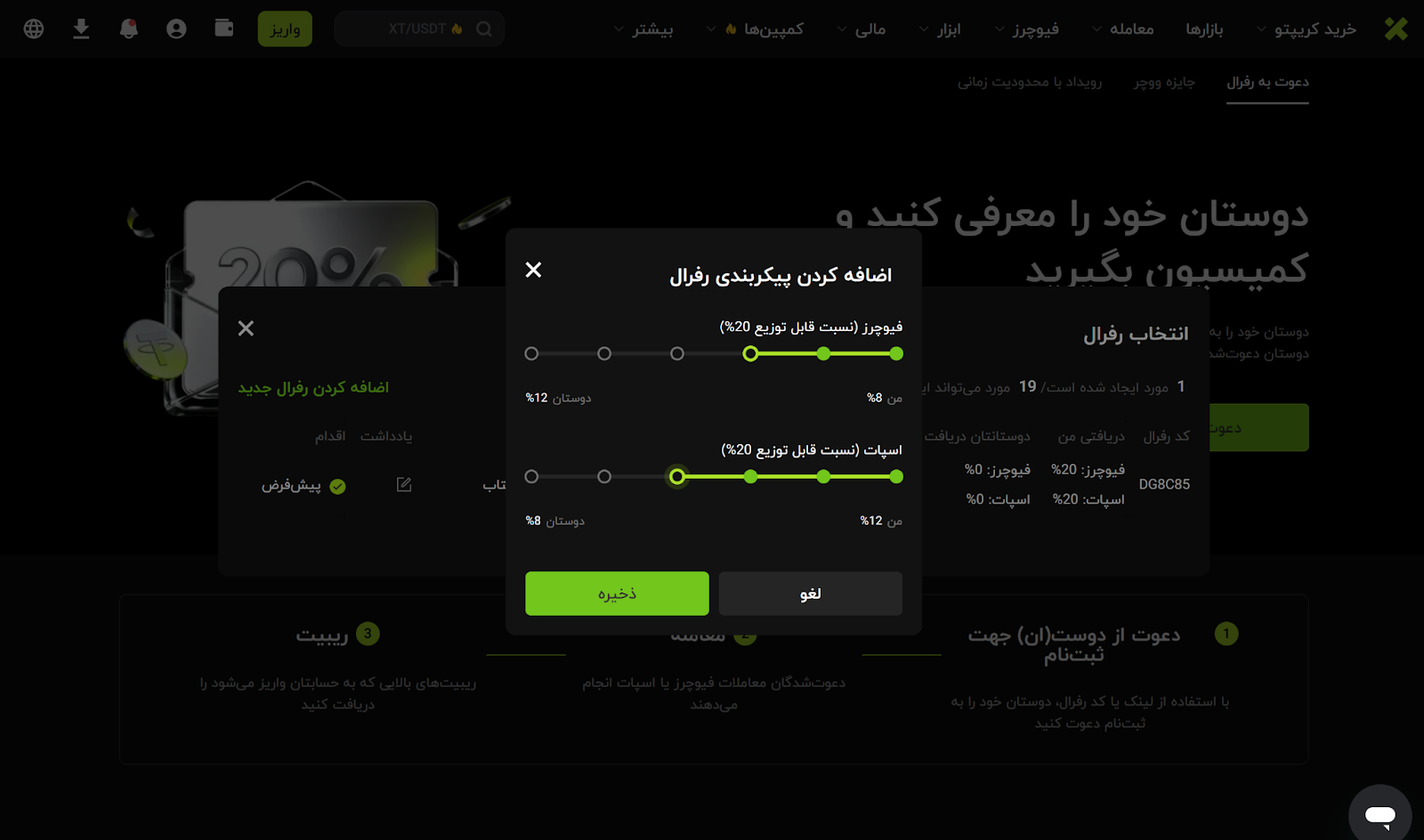 آیا می دانستید که از طریق برنامه رفرال XT می توانید 40٪ از کارمزد معاملات دوستان خود را کسب کنید؟ علاوه بر این، این شما هستید که تصمیم می گیرید کمیسیون بین شما و دوستتان چگونه تقسیم شود.