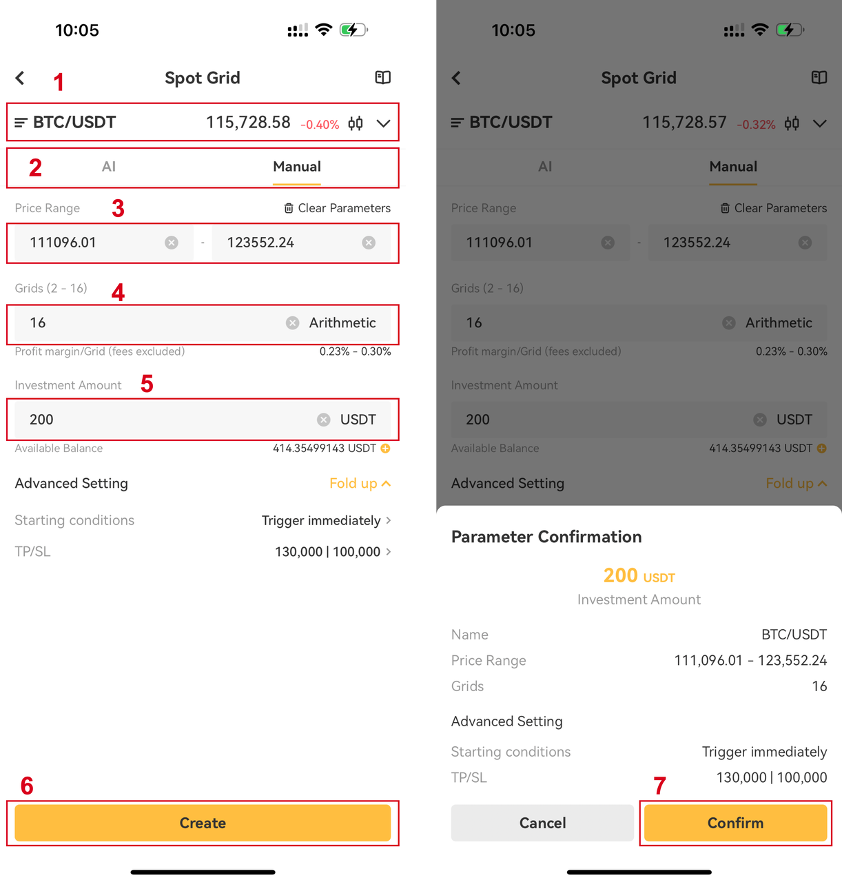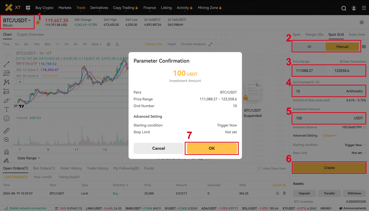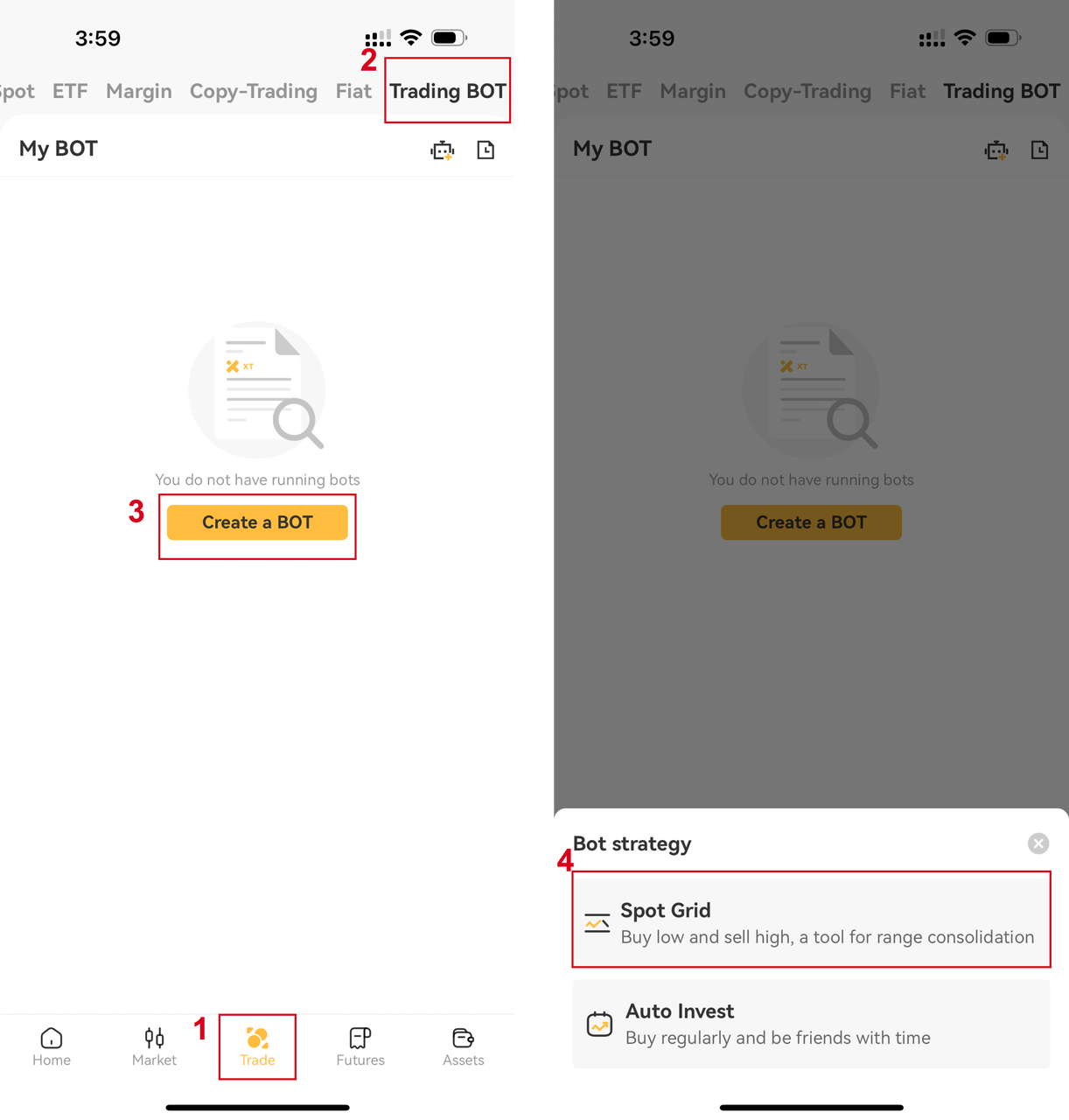 در اپلیکیشن معامله سپس ربات معامله ، روی Create BOT ضربه بزنید، از منوی استراتژی گزینه " گرید اسپات " را انتخاب کنید.