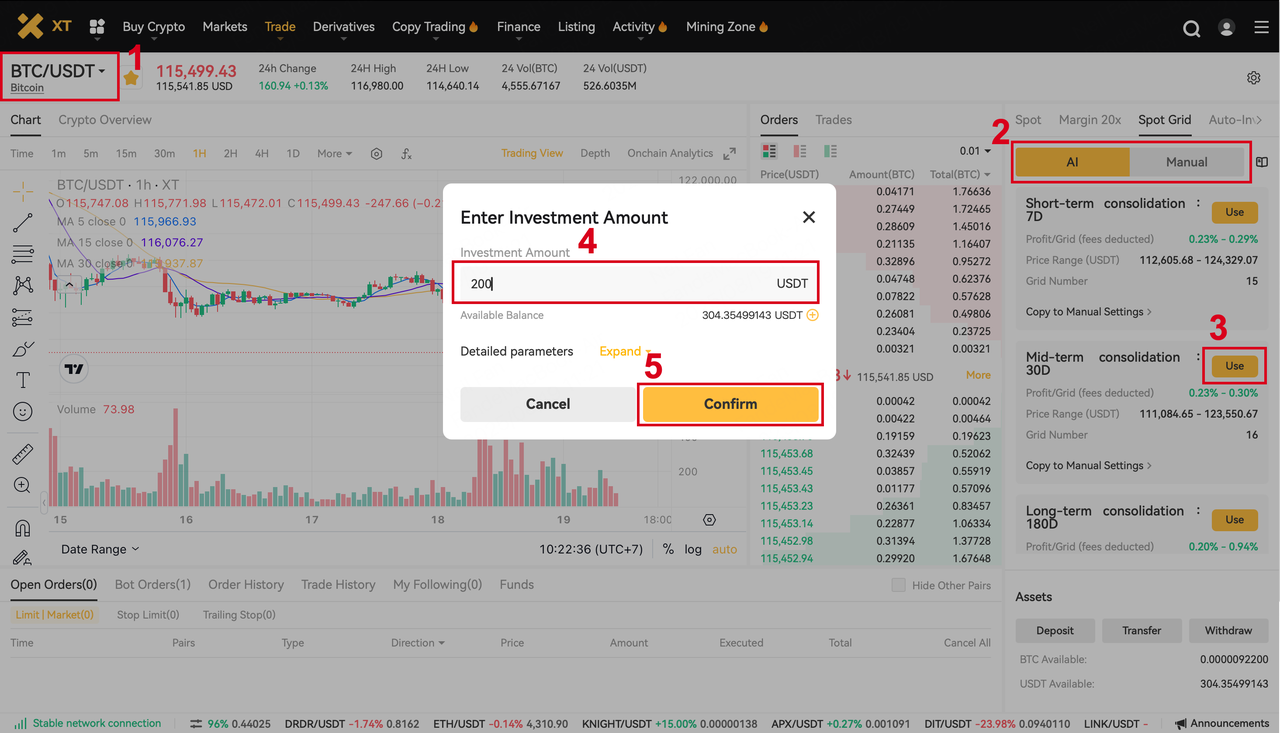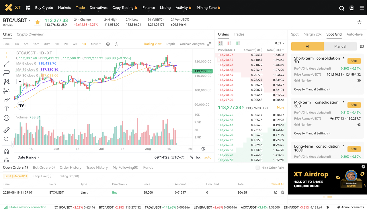 وب سایت XT.COM را باز کنید، وارد حساب شخصی خود شوید و در بالای صفحه بخش معامله و گرید اسپات را پیدا کنید.
