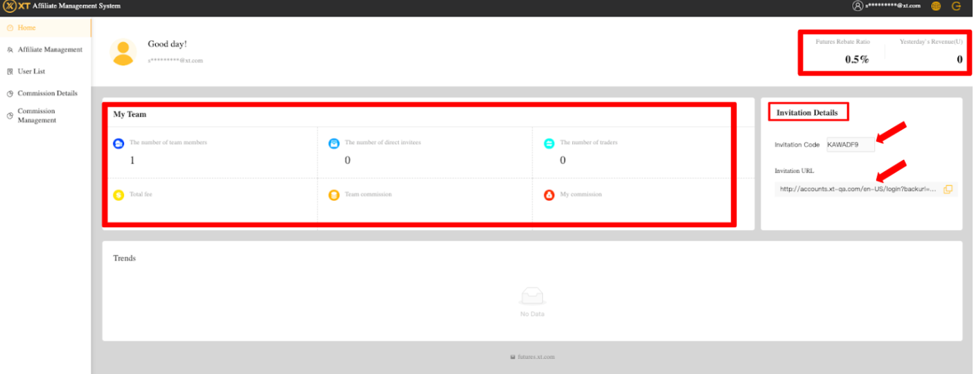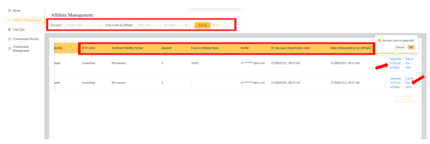 در این بخش، اگر بخواهید یکی از معامله گران خود را به همکار (Affiliate) ارتقا دهید، می توانید این کار را انجام دهید. همچنین امکان تنظیم نسبت تقسیم کمیسیون (Rebate Ratio) بین خود و همکارانتان در این صفحه وجود دارد.