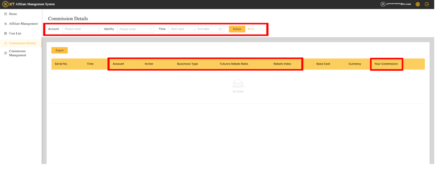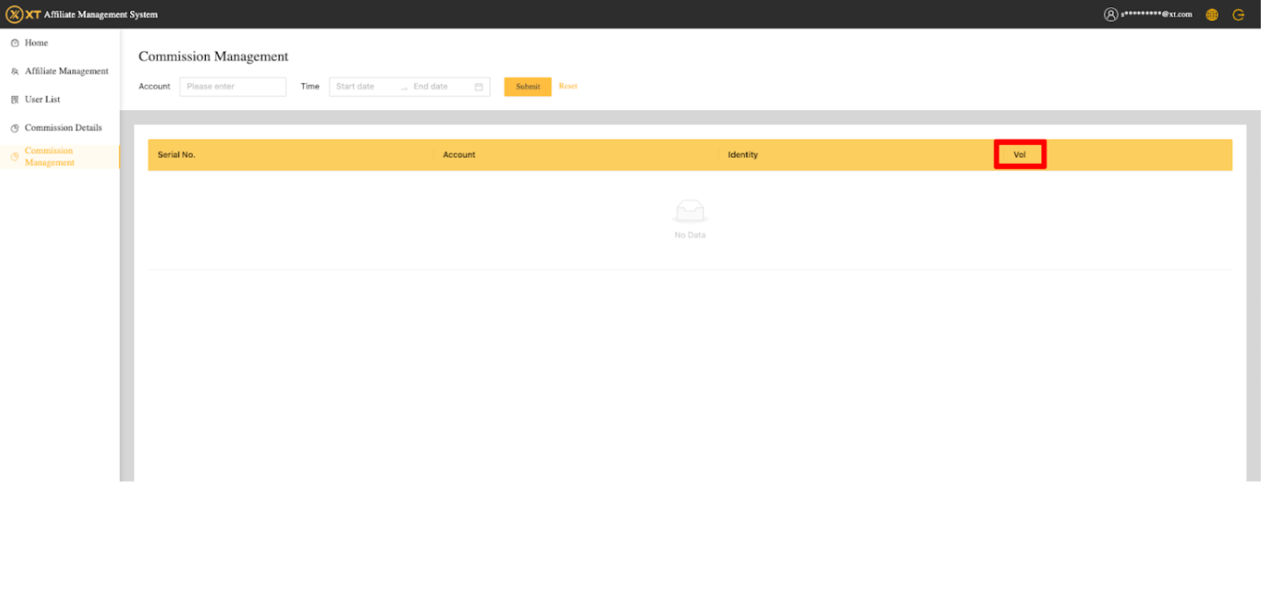 در این قسمت می توانید حجم معاملات انجام شده توسط هر یک از معامله گران یا همکاران خود را مشاهده کرده و بر اساس اطلاعات حساب کاربری (ایمیل یا شماره موبایل ثبت شده) یا بازه زمانی ثبت نام آن ها را فیلتر کنید.