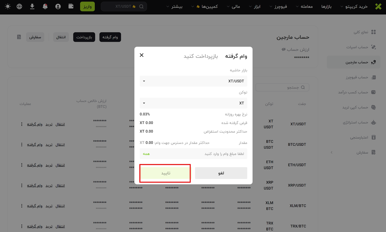 2. در صفحه وام گیری فعلی، بازار مارجین و ارز موردنظر را انتخاب کرده و مقدار وام را وارد کنید. پس از اطمینان از صحیح بودن نرخ بهره روزانه و سایر اطلاعات مرتبط، روی تایید کلیک کنید.