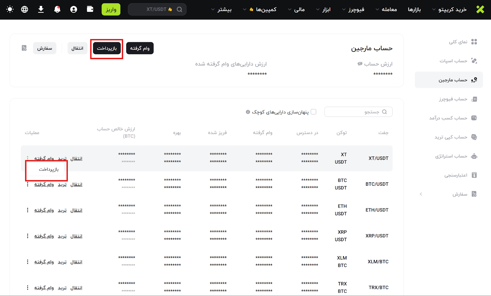 2. ارزی را که قصد بازپرداخت آن را دارید انتخاب کرده و روی گزینه بازپرداخت کلیک کنید، یا از بالای صفحه روی بازپرداخت بزنید.