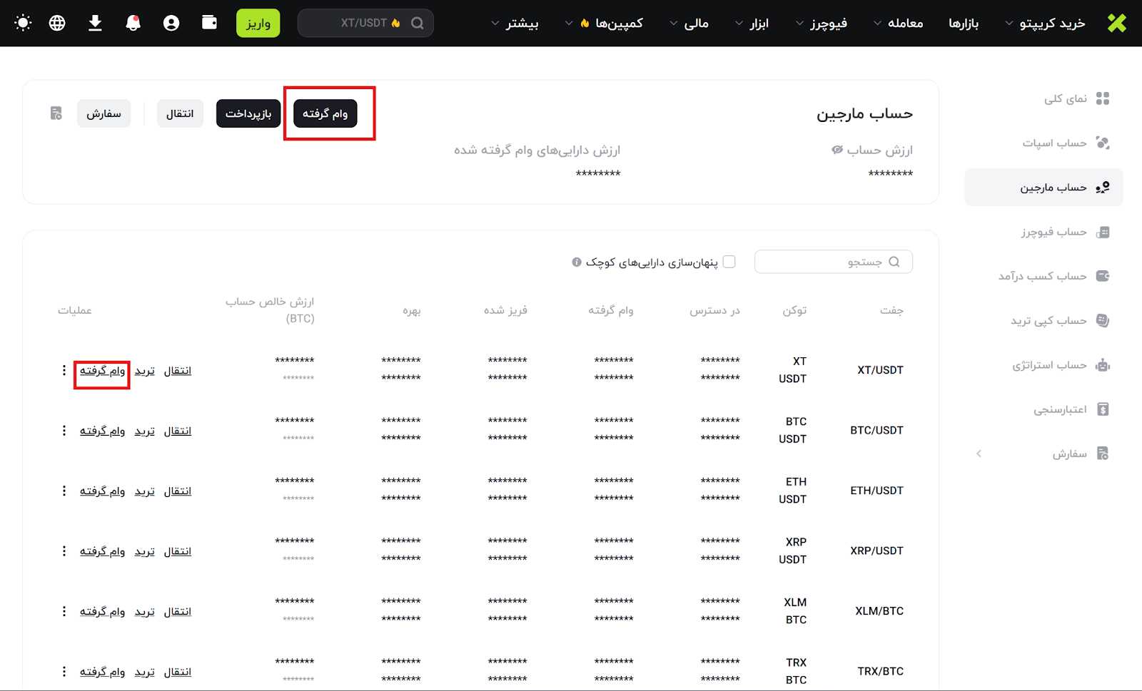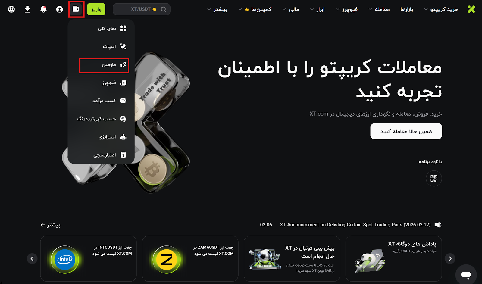 1. وارد حساب کاربری XT.COM خود شوید و از نوار بالای صفحه روی گزینه دارایی ها سپس مارجین کلیک کنید.