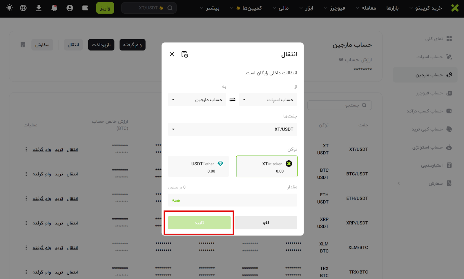 3. در صفحه انتقال فعلی، انتقال وجه از حساب اسپات/حساب فیوچرز به حساب مارجین را انتخاب کنید، سپس جفت معامله و ارز را مشخص کرده و مقدار انتقال را وارد کنید. در پایان روی تایید کلیک کنید.