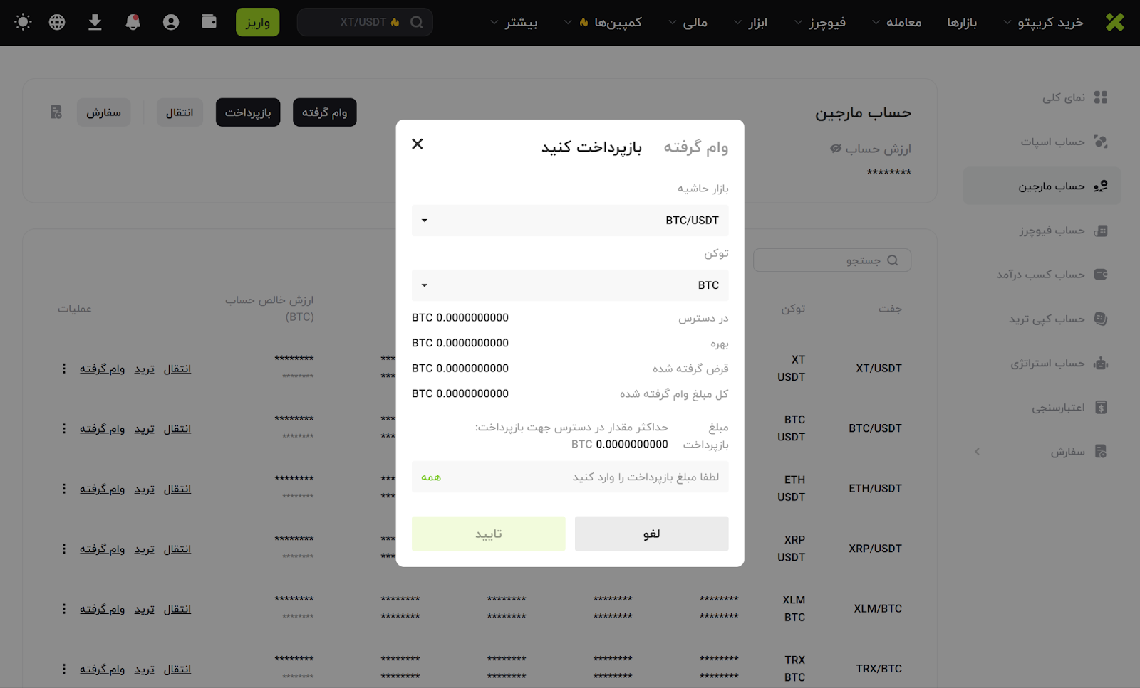 3.در صفحه بازپرداخت فعلی، بازار مارجین و ارز موردنظر را انتخاب کرده و مقدار بازپرداخت را وارد کنید. پس از اطمینان از صحیح بودن بهره و سایر اطلاعات مرتبط، روی تایید کلیک کنید.