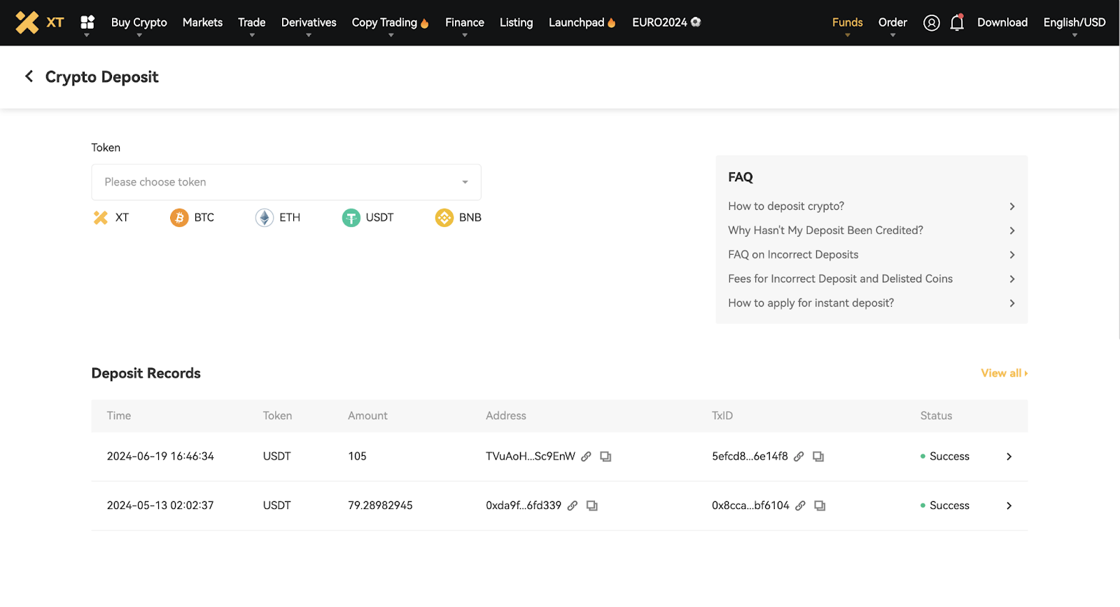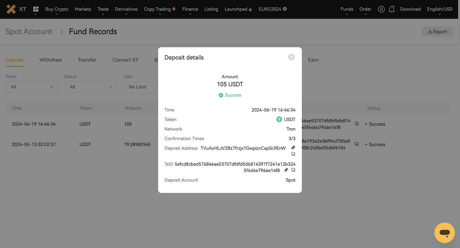 پس از ورود به وب سایت رسمی XT، می توانید با کلیک روی در بخش اسپات، سوابق واریز خود را مشاهده کنید.