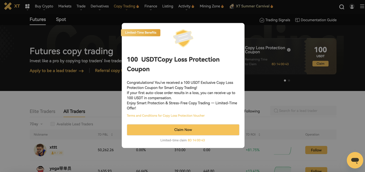 Ваучер защиты от убытков при копировании - это купон для защиты от рисков, специально разработанный для пользователей, занимающихся смарт-копированием. После активации ваучера, если первая сделка копирования пользователя (при следовании за трейдером) закрывается с убытком, платформа компенсирует убыток согласно установленным правилам (в пределах номинальной стоимости ваучера, выраженной в USDT).