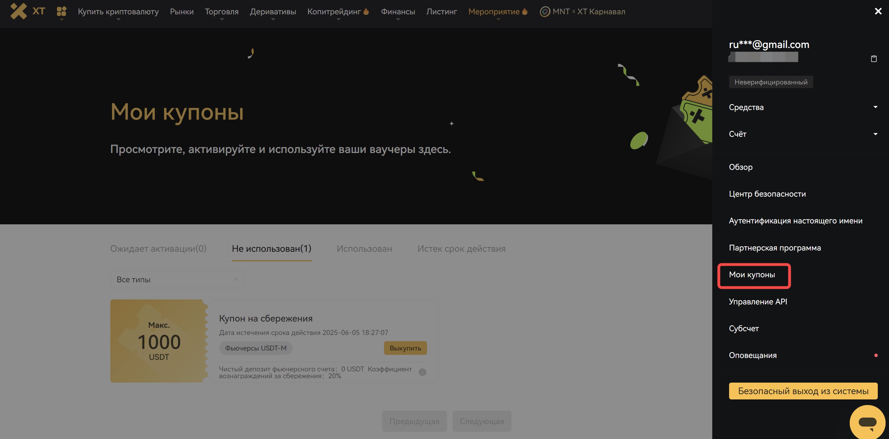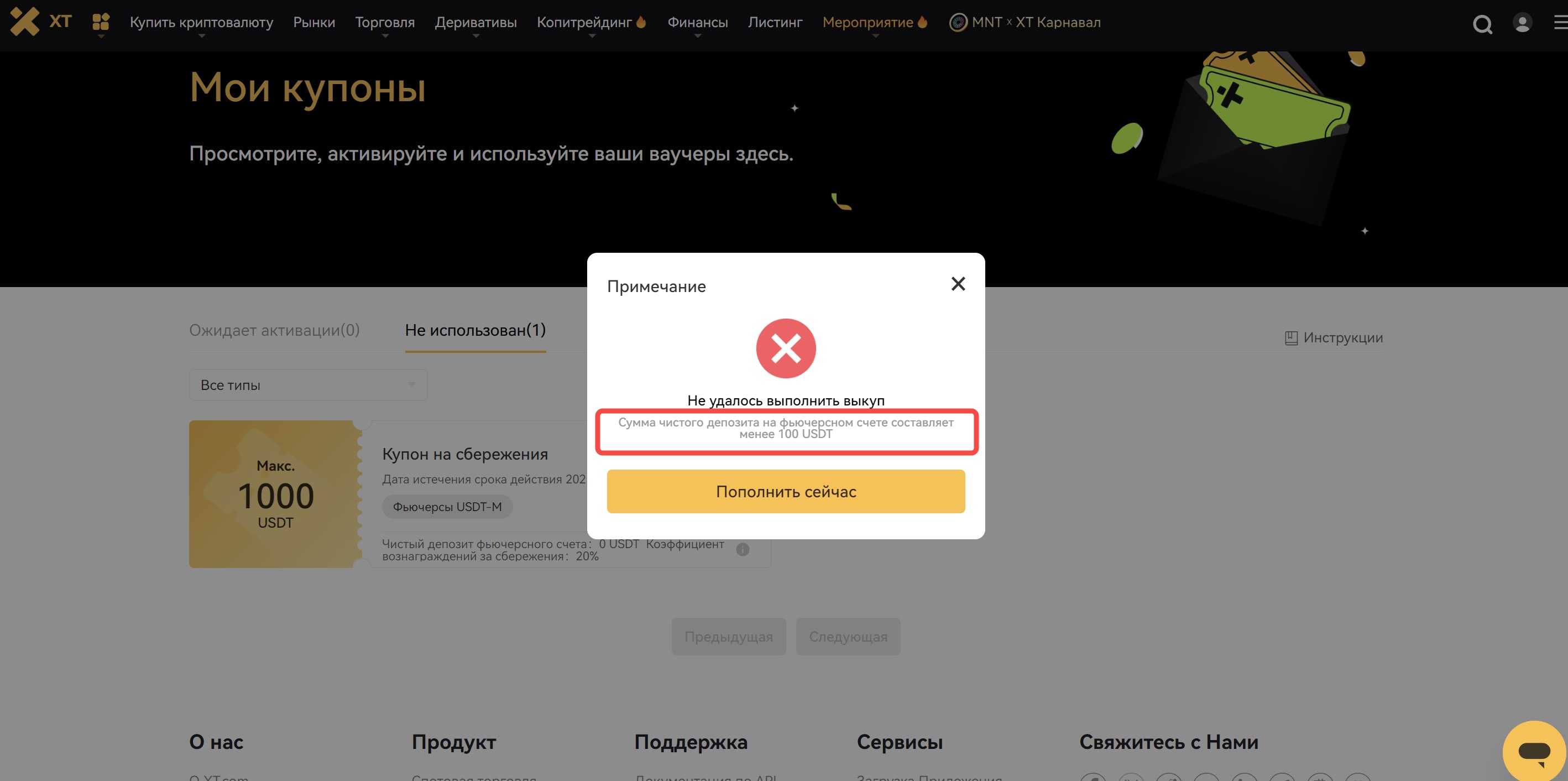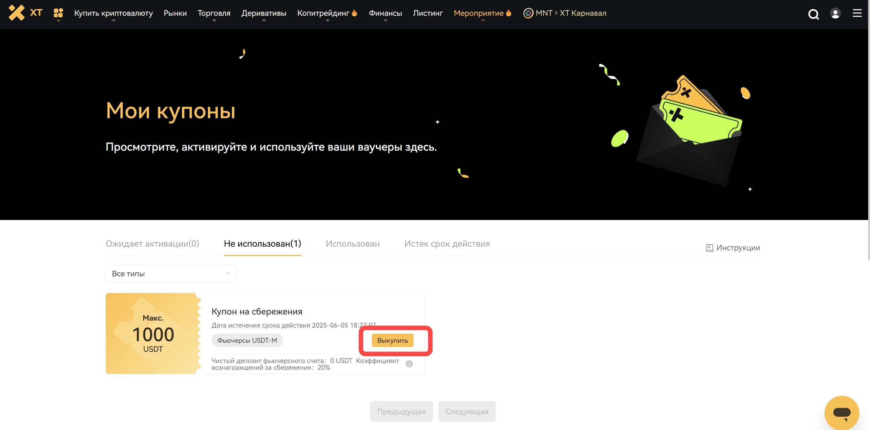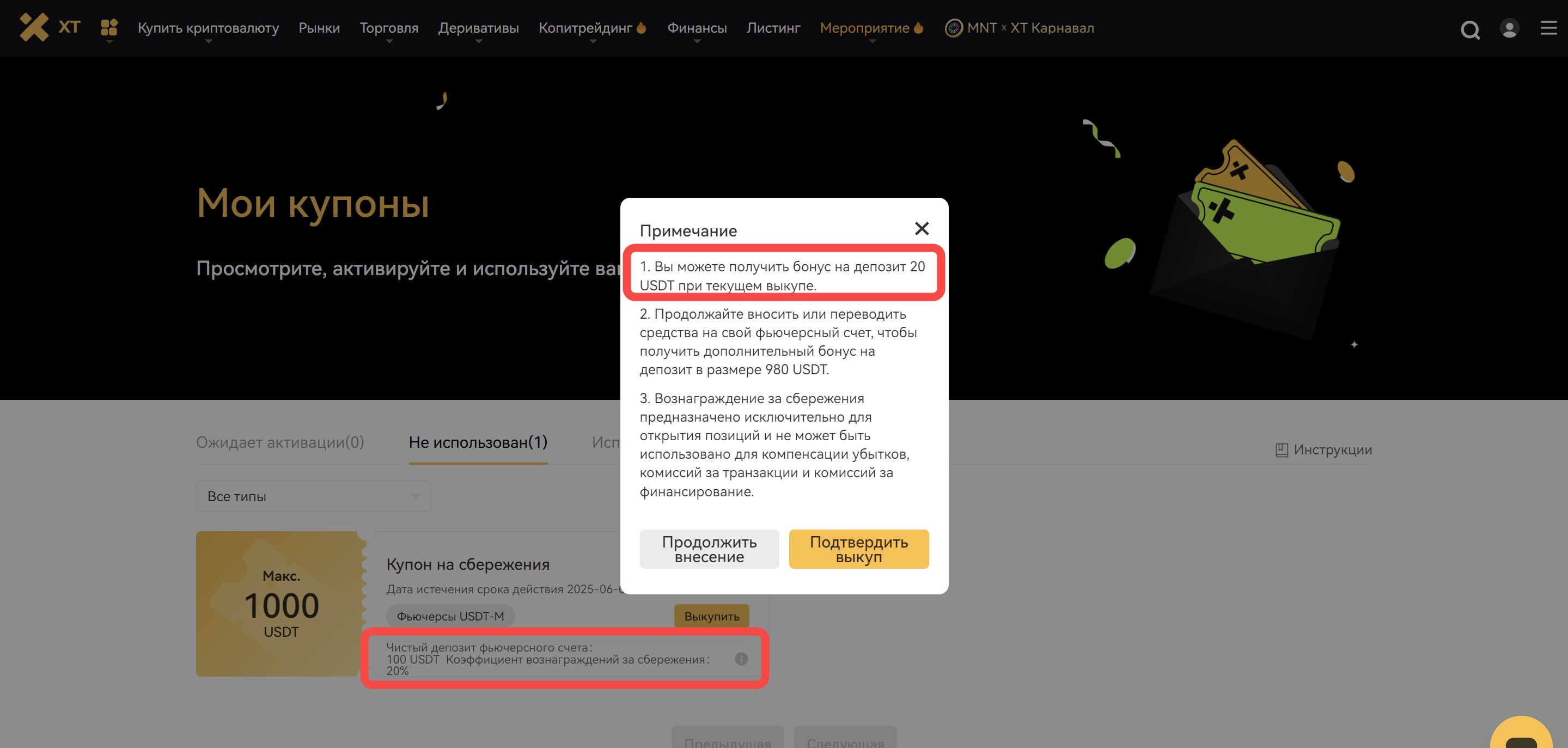 Примечание: В случае злоупотребления купонами, платформа оставляет за собой право предпринять меры в отношении аккаунта для компенсации убытков. XT оставляет за собой право окончательной интерпретации правил использования купонов.