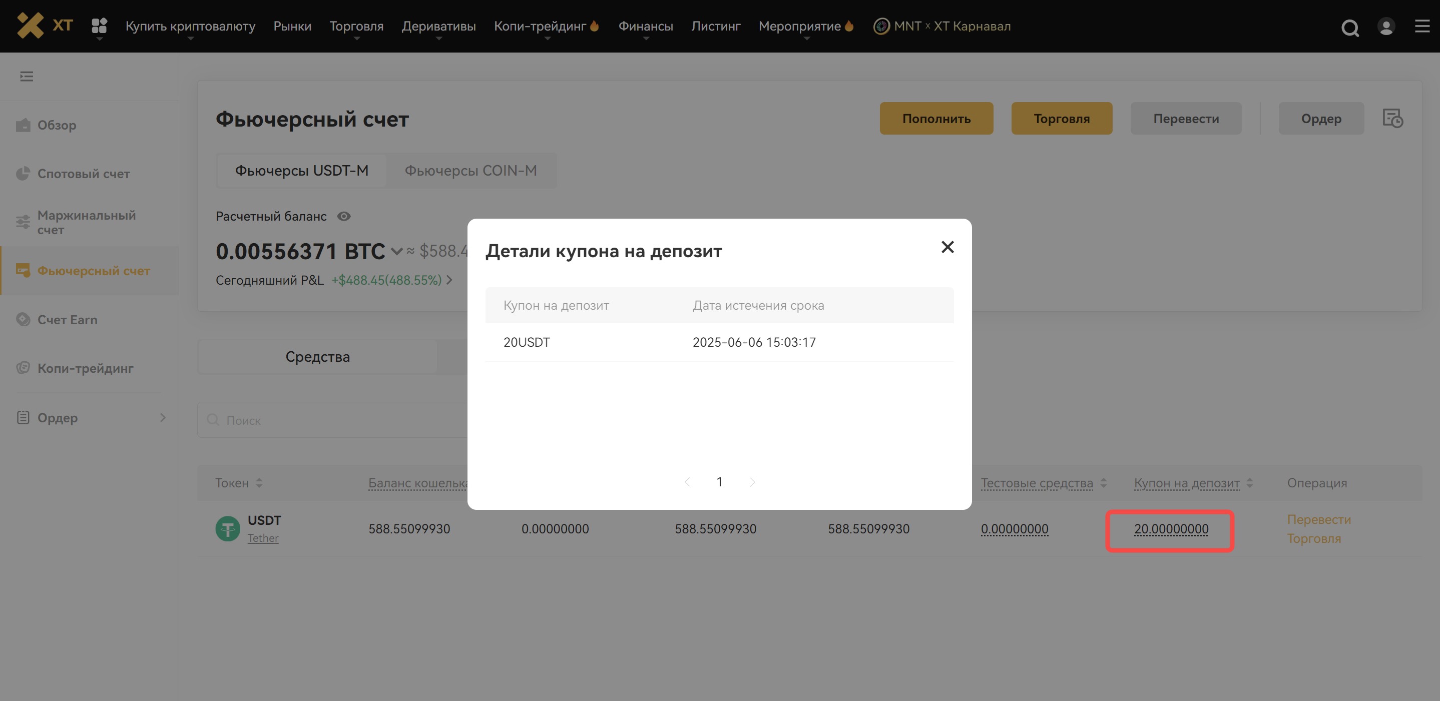 Перейдите в раздел Активы → Фьючерсный счет, чтобы посмотреть детали купона, включая баланс и дату окончания действия.
