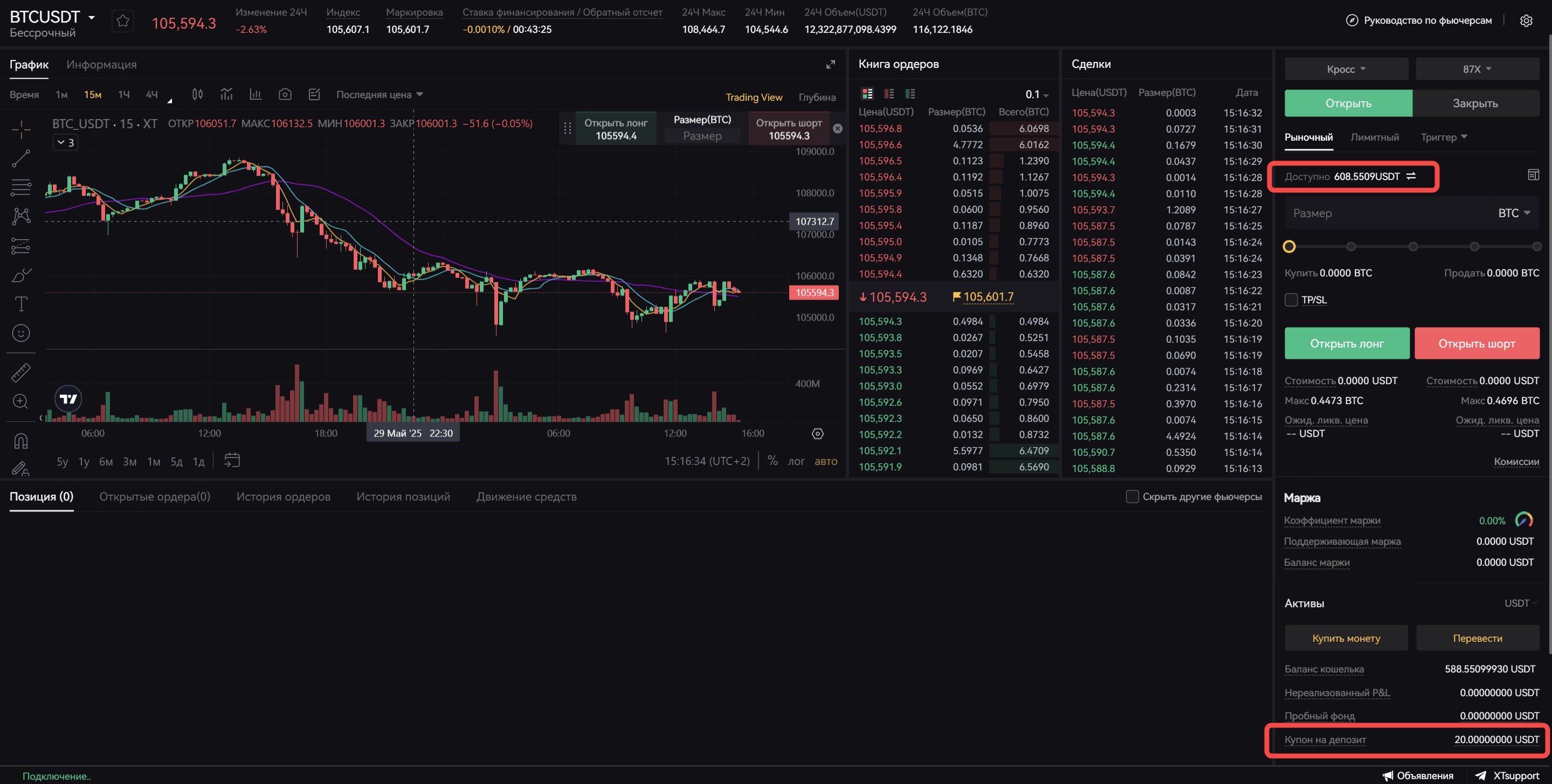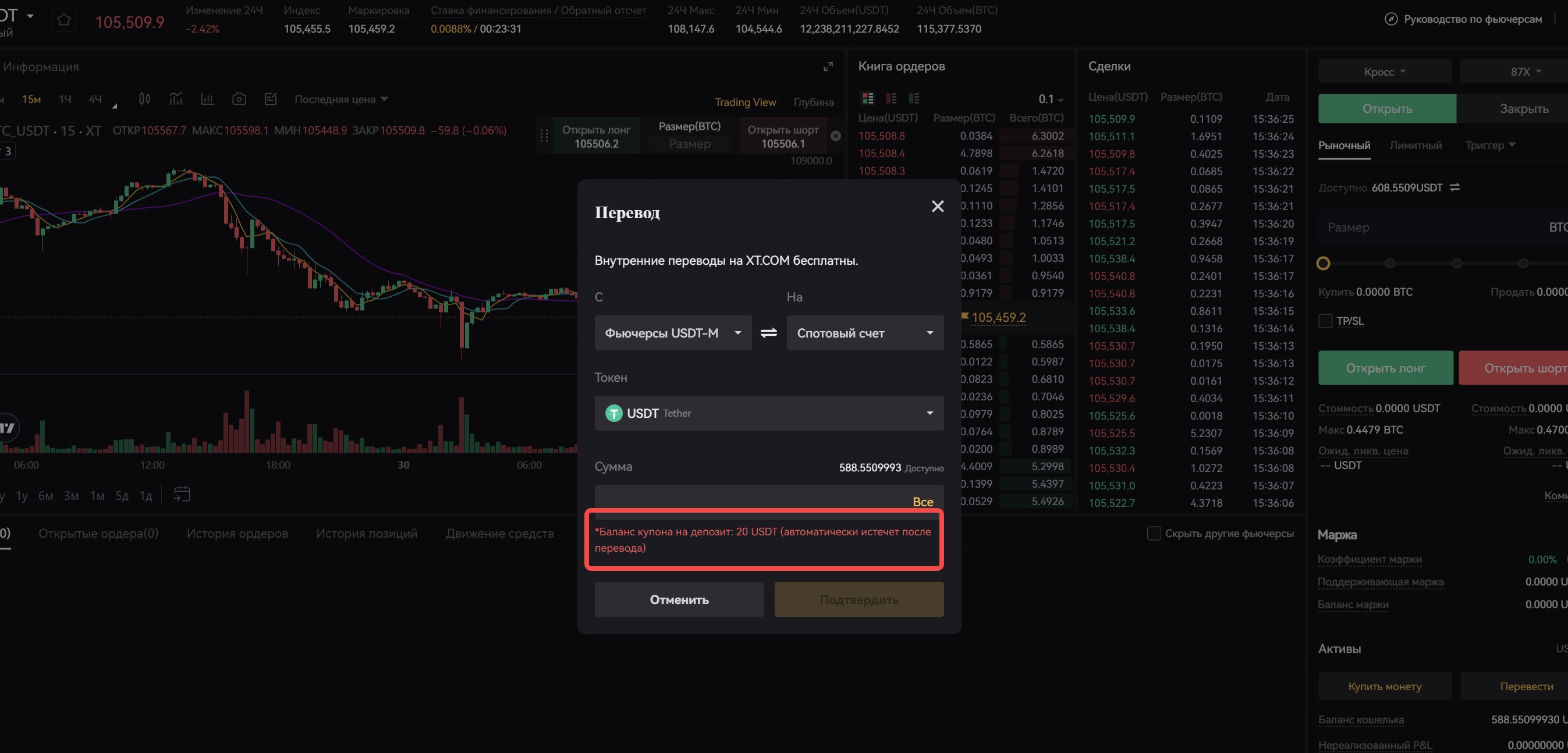 Купоны на фьючерсный депозит XT в настоящее время доступны только для Фьючерсов USDT-M. Их можно использовать только в качестве маржи вместе с личными средствами и нельзя использовать для компенсации торговых комиссий, ставок финансирования или потерь по позициям.