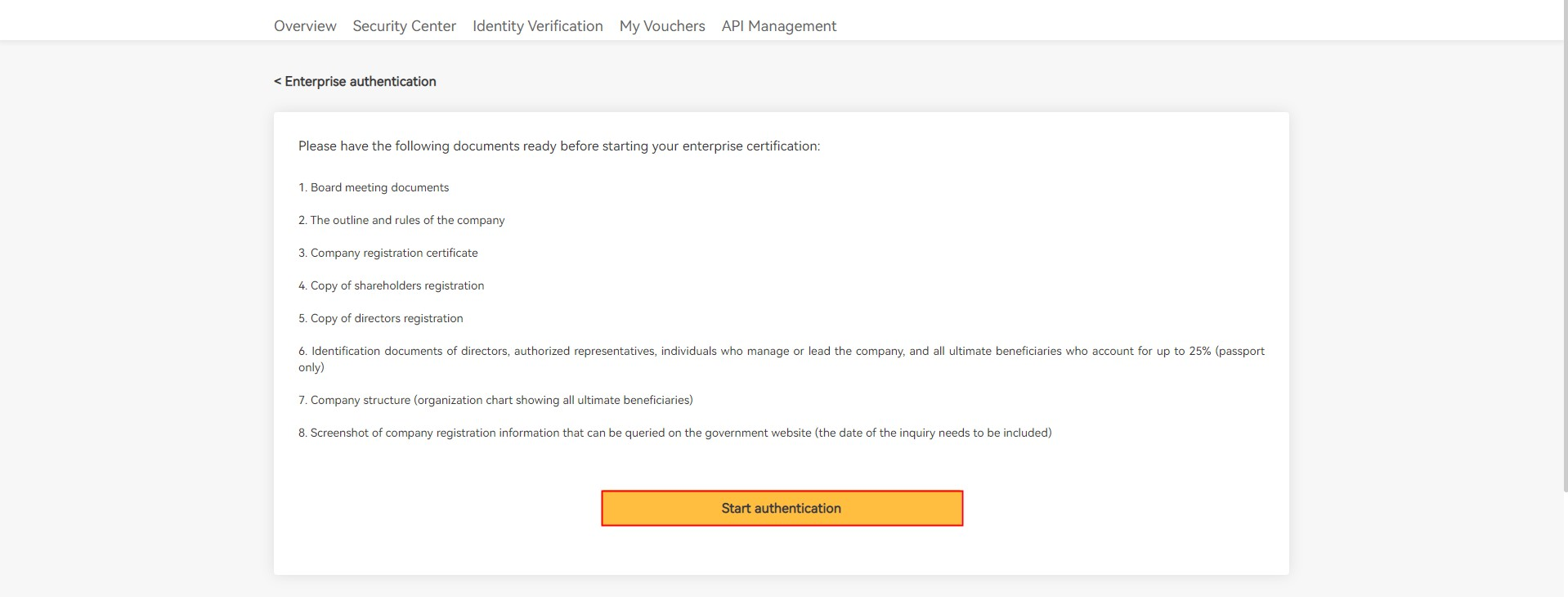Шаг 3: Нажмите "Пройти проверку сейчас". Убедитесь, что у вас готовы все необходимые документы, прежде чем нажимать "Начать аутентификацию".