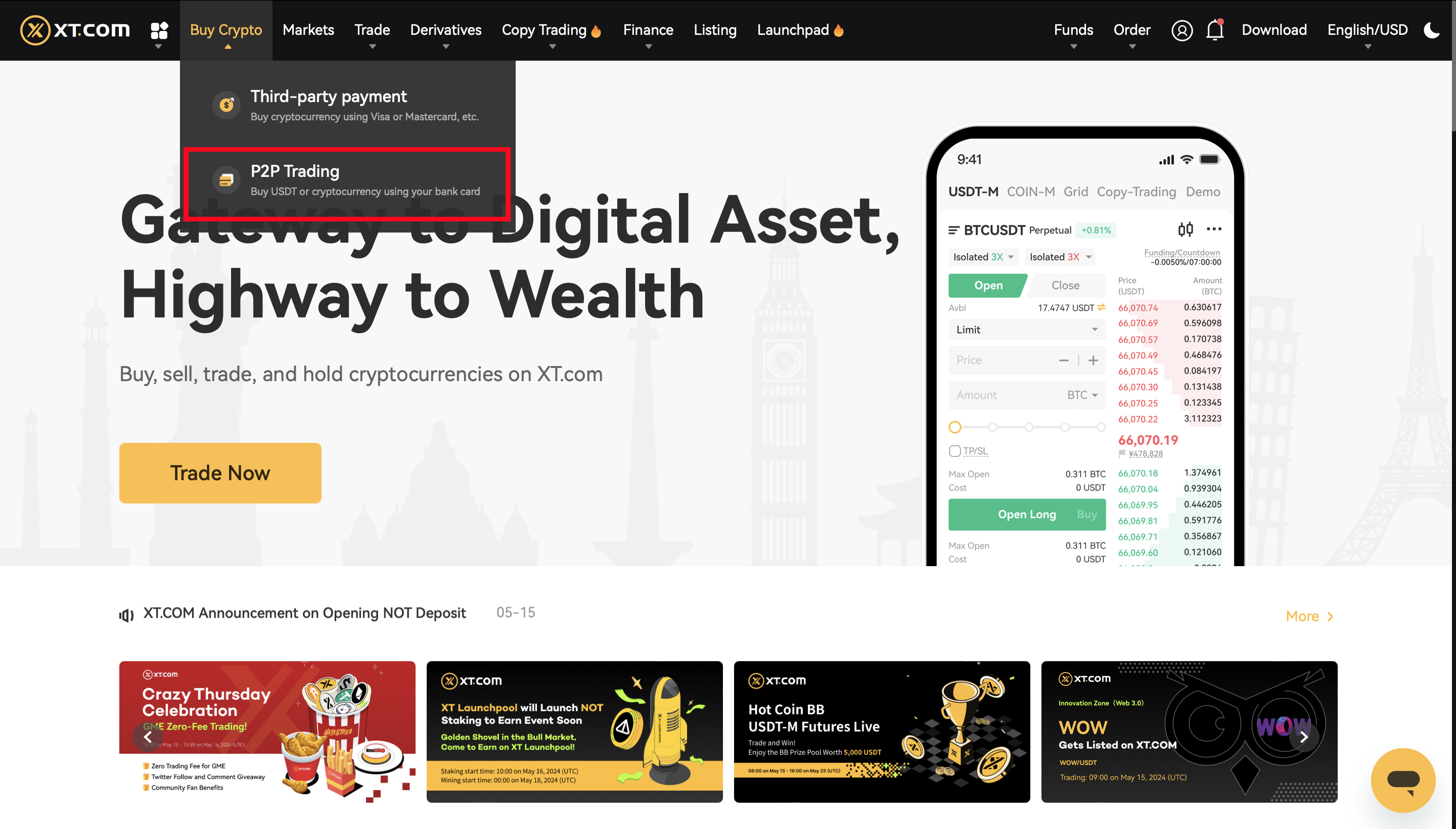 1. Truy cập XT.com và tìm "Mua Crypto" - "Giao dịch P2P" trên thanh điều hướng trên cùng.
