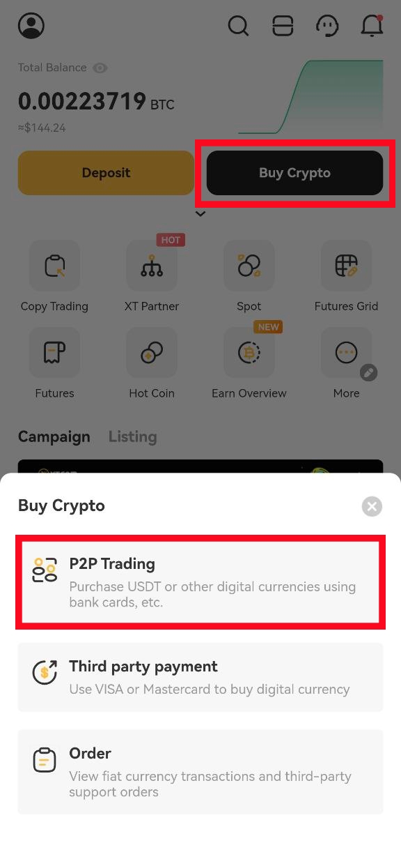 1. Tìm "Mua Crypto" trên trang chủ ứng dụng XT và chọn [Giao dịch P2P].